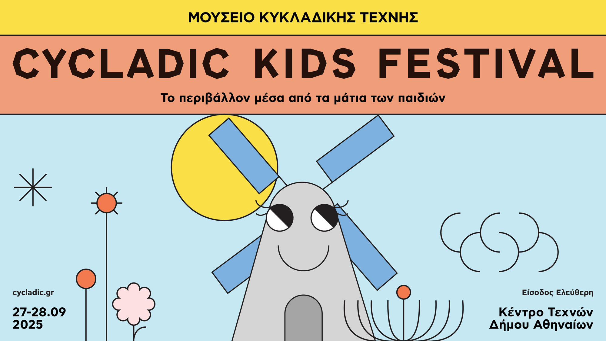 Με θέμα το περιβάλλον, το Cycladic Kids Festival, το παιδικό φεστιβάλ του Μουσείου Κυκλαδικής Τέχνης, θα πραγματοποιηθεί φέτος στις 27 και 28 Σεπτεμβρίου στο Κέντρο Τεχνών του Δήμου Αθηναίων (Πάρκο Ελευθερίας) και σας περιμένει με ελεύθερη είσοδο! Για τρίτη συνεχόμενη χρονιά, το Μουσείο Κυκλαδικής Τέχνης δημιουργεί ένα πολυθεματικό φεστιβάλ τεχνών με παραστάσεις θεάτρου, μουσικής και χορού, κινηματογράφο, αφηγήσεις και εικαστικά εργαστήρια εκτός των χώρων του, ανοιχτό και προσβάσιμο σε όλα τα παιδιά 4 έως 15 ετών. Το φεστιβάλ πραγματοποιείται σε συνεργασία με τον Οργανισμό Πολιτισμού, Αθλητισμού και Νεολαίας Δήμου Αθηναίων (ΟΠΑΝΔΑ) και Μεγάλο Χορηγό την EurolifeFFH.
