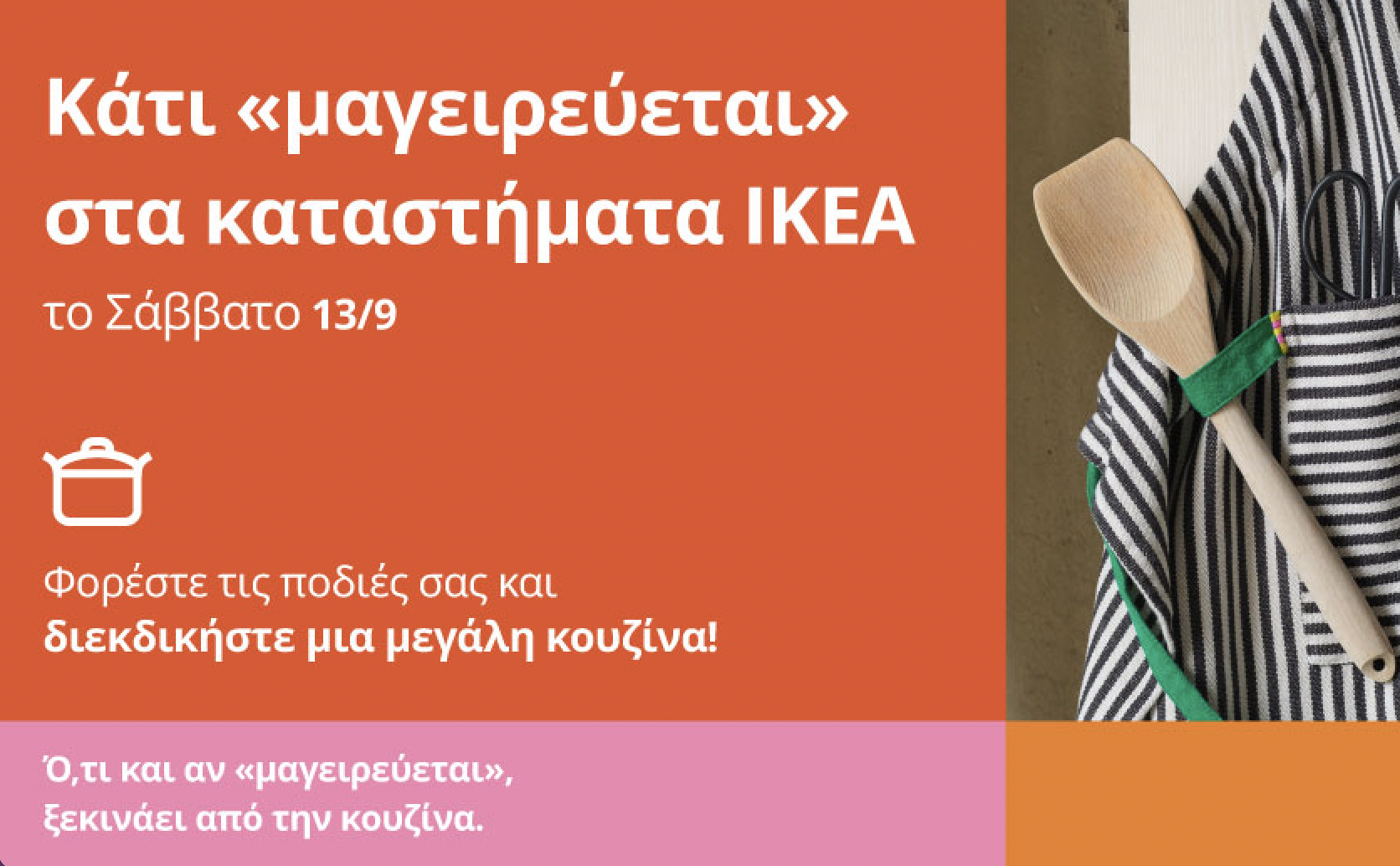 Η ΙΚΕΑ, εταιρεία του ομίλου Fourlis, σας προσκαλεί να φορέσετε τις ποδιές σας και να ανακαλύψετε τι «μαγειρεύεται» στα καταστήματα ΙΚΕΑ. H καρδιά του σπιτιού, η κουζίνα, είναι το σημείο όπου ξεκινούν όλα, από τις πιο νόστιμες δημιουργίες μέχρι τις πιο ζεστές αναμνήσεις.