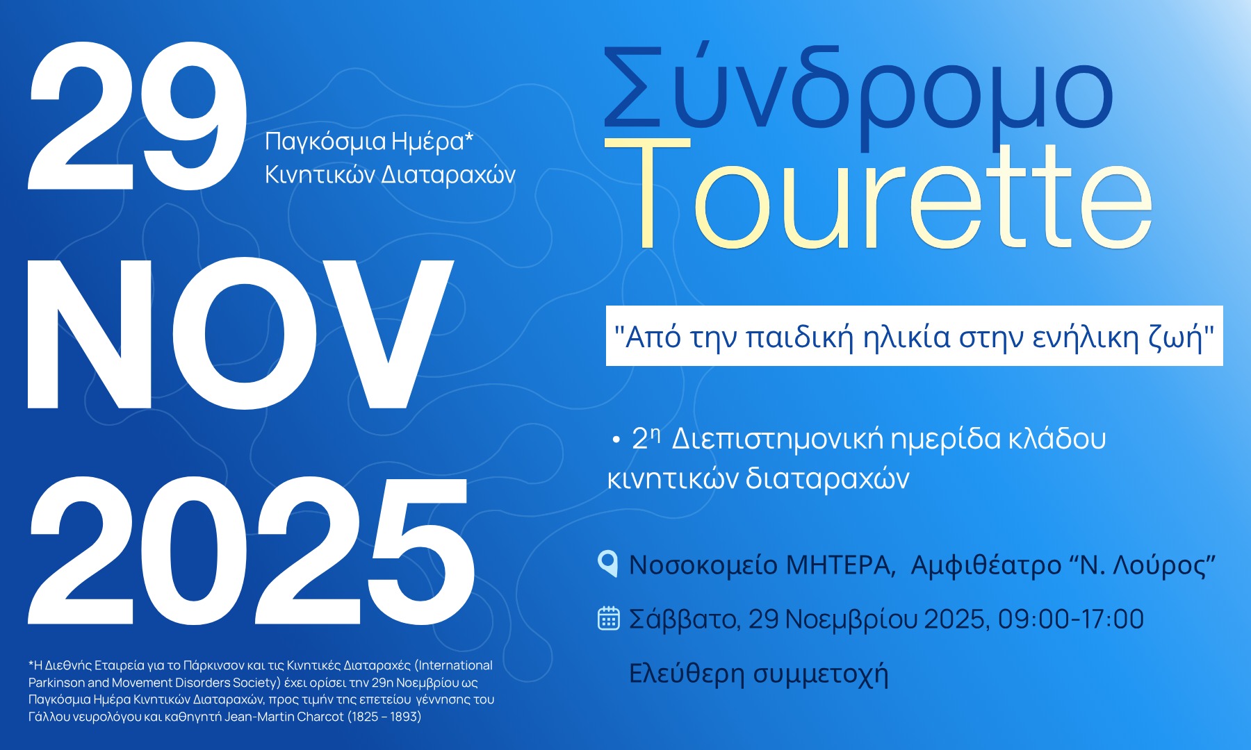 Η 2η διεπιστημονική ημερίδα για τις κινητικές διαταραχές, αφιερωμένη στο σύνδρομο Tourette, θα διεξαχθεί το Σάββατο 29 Νοεμβρίου 2025 στο αμφιθέατρο Ν. Λούρος του Νοσοκομείου ΜΗΤΕΡΑ, από τις 09:00 έως τις 17:00.