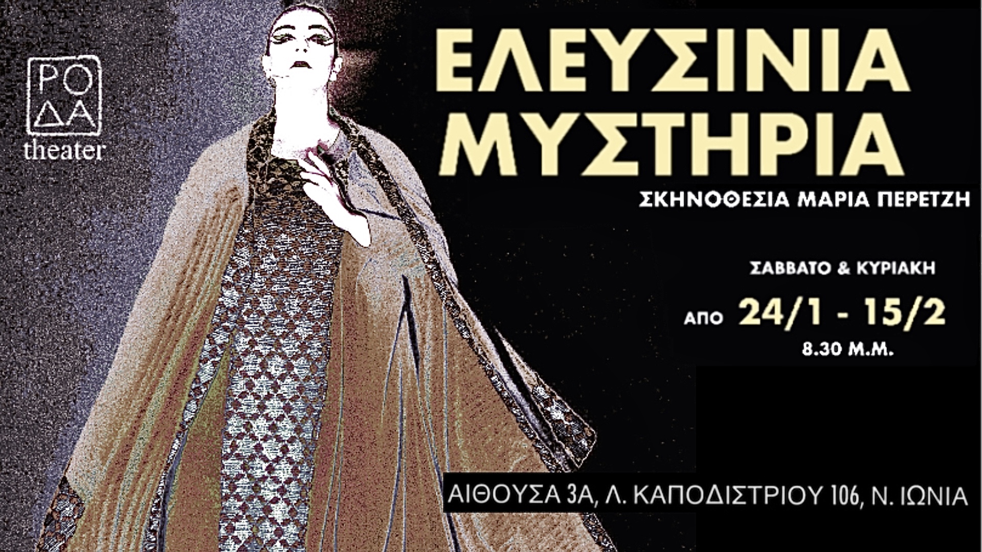 Μετά τη βράβευσή της για τη δημιουργία της Ελληνικής παράδοσης του θεάτρου του Ιερού, η ΡΟΔΑ επιστρέφει στην Αίθουσα 3Α υπό την αιγίδα του Ομίλου για την UNESCO Πειραιώς και Νήσων και του Διεθνούς Οργανισμού International Action Art.