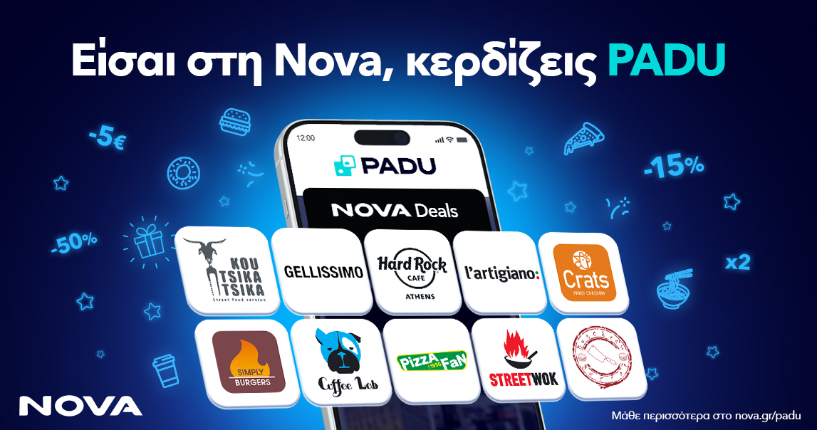 Η Nova ενισχύει περαιτέρω την εμπειρία επιβράβευσης των συνδρομητών της, μέσα από τη συνεργασία της με το PADU, προσφέροντας ακόμη μεγαλύτερη αξία στην καθημερινότητά τους, με αποκλειστικές εκπτώσεις και μοναδικά deals σε αγαπημένα brands φαγητού και καφέ.