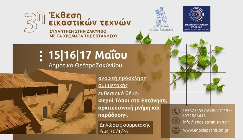 Η Ένωση Επτανησίων Ελλάδας και ο Δήμος Ζακύνθου συνδιοργανώνουν την 3η Έκθεση Εικαστικών Τεχνών, στο πλαίσιο του εορτασμού της 162ης επετείου της Ένωσης των Επτανήσων με την Ελλάδα, με τίτλο «Συνάντηση στη Ζάκυνθο με τα χρώματα της Επτανήσου», η οποία θα πραγματοποιηθεί στο Δημοτικό Θέατρο Ζακύνθου, στις 15, 16 και 17 Μαΐου 2026.