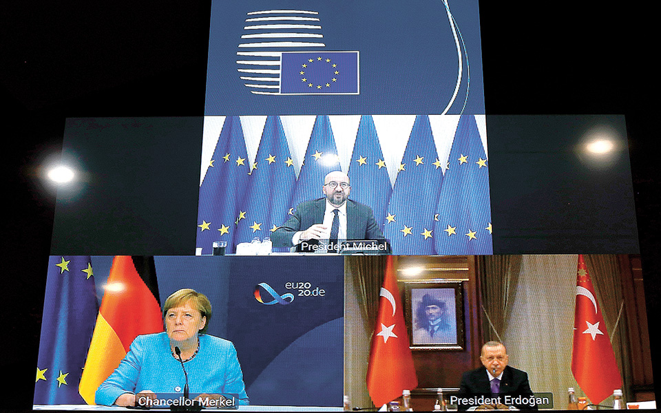 Και χθες, με βάση τις ανακοινώσεις της τουρκικής προεδρίας, ο κ. Ερντογάν επανήλθε με πρόταση μιας «περιφερειακής διάσκεψης» για την Ανατολική Μεσόγειο, «συμπεριλαμβανομένων των Τουρκοκυπρίων», εκτιμώντας ότι αυτή «θα μπορούσε να λάβει θετικές και εποικοδομητικές αποφάσεις προς όφελος όλων». Αναφερόμενος στα ευρωτουρκικά, ο κ. Ερντογάν επισήμανε ότι οι σχέσεις Ευρώπης – Τουρκίας θα μπορούσαν να βελτιωθούν ξανά, αν σημειώνονταν «συγκεκριμένα» βήματα στα ζητήματα της τελωνειακής ένωσης, του μεταναστευτικού – προσφυγικού και της «φιλελευθεροποίησης» του καθεστώτος χορήγησης βίζας προς Τούρκους πολίτες. Στο πλευρό του προέδρου κατά τη διάρκεια της τηλεδιάσκεψης ήταν παρόντες όλοι όσοι μπορεί να χαρακτηριστούν ο σκληρός πυρήνας της κυβέρνησης Ερντογάν, ο υπουργός Εθνικής Αμυνας Χουλουσί Ακάρ, των Εξωτερικών Μεβλούτ Τσαβούσογλου, ο επικεφαλής της ΜΙΤ Χακάν Φιντάν, ο εκπρόσωπος Ιμπραήμ Καλίν και ο διευθυντής επικοινωνίας της προεδρίας Φαρετίν Αλτούν.