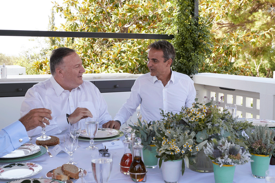 Γεύμα εργασίας είχαν το μεσημέρι της Τρίτης στο πατρικό σπίτι του Κυριάκου Μητσοτάκη στο Ακρωτήρι, ο πρωθυπουργός και ο Αμερικανός υπουργός Εξωτερικών, Μάικ Πομπέο, με τον Αμερικανό Πρέσβη στην Αθήνα, Τζέφρι Πάιατ, αμέσως μετά το πέρας της κοινής τους επίσκεψης στη στρατιωτική βάση της Σούδας. Σύμφωνα με πληροφορίες από τοπικά ΜΜΕ, το τραπέζι περιελάμβανε πλούσιο μενού με παραδοσιακά κρητικά εδέσματα και ντόπια πιάτα.