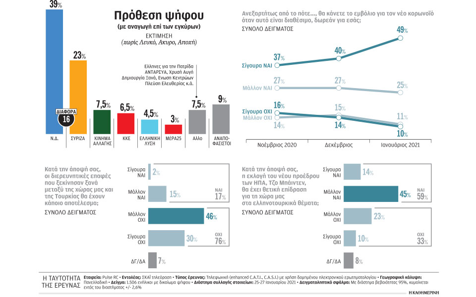 Ανθεκτική εμφανίζεται σε ακόμα μία μέτρηση η Ν.Δ., παρά την πίεση που δέχεται η κυβέρνηση από την ανησυχητική εξέλιξη της πανδημίας. Στη δημοσκόπηση της Pulse που διενεργήθηκε για τον ΣΚΑΪ, στο ερώτημα «αν την ερχόμενη Κυριακή είχαμε εθνικές εκλογές, τι θα ψηφίζατε» η πλειοψηφία διατηρεί το προβάδισμα των 16 μονάδων του περασμένου μήνα. Με αναγωγή επί των εγκύρων, το 39% των ερωτηθέντων δήλωσε ότι επιλέγει να ψηφίσει Ν.Δ., με τη γαλάζια παράταξη να χάνει μία μονάδα σε σχέση με τη σφυγμομέτρηση που πραγματοποιήθηκε στις 12-16 Δεκεμβρίου. Το 23% επιλέγει ΣΥΡΙΖΑ έναντι 24% ένα μήνα πριν. Το ΚΙΝΑΛ φτάνει το 7,5% κερδίζοντας μισή μονάδα, όπως και το ΚΚΕ που ανέβηκε στο 6,5%. Στα ίδια ποσοστά παρέμειναν η Ελληνική Λύση, 4,5%, και το ΜέΡΑ25 με 3%. Eνα ποσοστό 7,5% υποστηρίζει μικρότερα εξωκοινοβουλευτικά κόμματα (Eλληνες για την Πατρίδα, ΑΝΤΑΡΣΥΑ, Χρυσή Αυγή, Δημιουργία Ξανά, Εν. Κεντρώων, Πλεύση Ελευθερίας κ.ά.) και το 9% δηλώνει αναποφάσιστο.