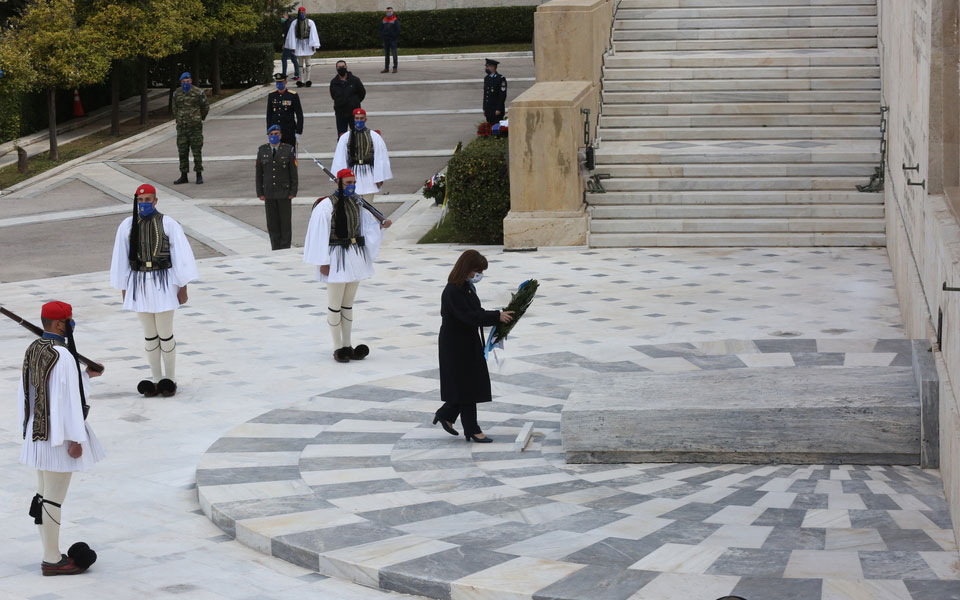 Ακολουθώντας το τελετουργικό, η μπάντα του Πολεμικού Ναυτικού παιάνισε τον Ελληνικό Εθνικό Ύμνο, καθώς και τους Εθνικούς Ύμνους των χωρών των υψηλών προσκεκλημένων που κατέθεσαν στεφάνι στο Μνημείο του Άγνωστου Στρατιώτη, ενώ άγημα της Προεδρικής Φρουράς απέδωσε τιμές στην Πρόεδρο της Δημοκρατίας και στους ξένους ηγέτες.
