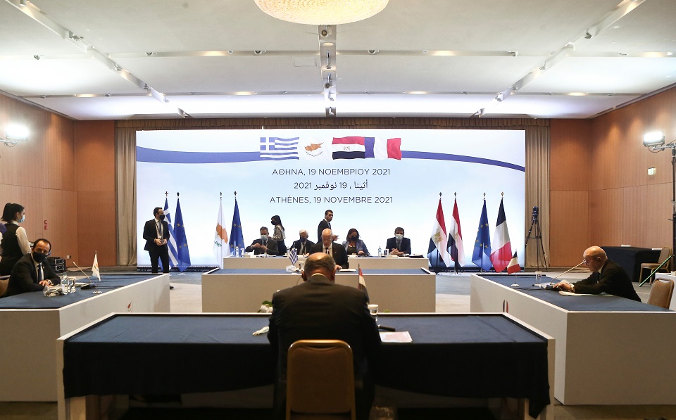 Οι υπουργοί Εξωτερικών της Ελλάδας, της Κύπρου, της Αιγύπτου και της Γαλλίας εξέτασαν τις κοινές προκλήσεις και ευκαιρίες στην ευρύτερη περιοχή, στην Ανατολική Μεσόγειο, στη Μέση Ανατολή, στο Σαχέλ, καθώς και την εμβάθυνση της συνεργασίας τους σε στρατηγικούς τομείς, όπως η ενέργεια, η οικονομία, ο τουρισμός, η διασυνδεσιμότητα. Επίσης, συζήτησαν ζητήματα όπως η εξάπλωση της τρομοκρατίας στην Αφρική, η μετανάστευση, η πρόσβαση σε βασικά αγαθά όπως το νερό του Νείλου.