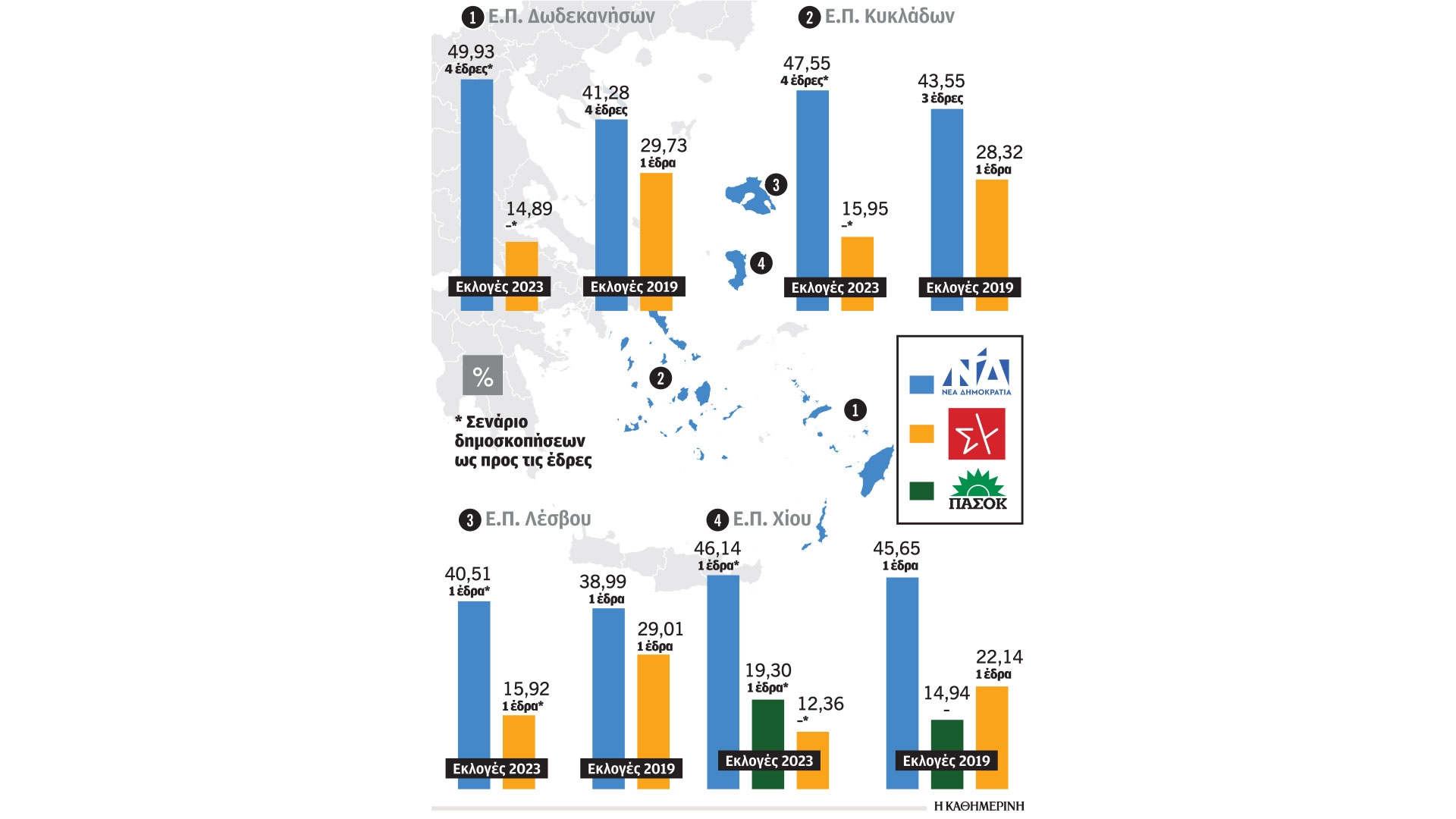 Στην Περιφέρεια Δωδεκανήσου: Οπως προβλέπεται, η Ν.Δ., που αύξησε εντυπωσιακά τα ποσοστά της σε σχέση με το 2019 (από 41,28% πήγε στο 49,93%), εάν διατηρήσει τη δυναμική της θα πάρει την έδρα που φαινόταν στις 21.5 να κερδίζει ο ΣΥΡΙΖΑ –αν και είχε απώλειες 15 μονάδων– και έτσι θα εισέλθει ξανά στη Βουλή ο Β. Υψηλάντης, συνδιαμορφώνοντας έτσι μαζί με τους Μ. Σαλμά, Κ. Καραγκούνη και Αθ. Παπαθανάση την τετραμελή τοπική «γαλάζια» κοινοβουλευτική ομάδα. Αυτή η αλλαγή εάν συντελεστεί σημαίνει ότι τερματίζεται η βουλευτική θητεία της νεοεκλεγείσας με τον ΣΥΡΙΖΑ στην κάλπη του Μαΐου Χρυσούλας Καραγιάννη. Το ΠΑΣΟΚ, από την άλλη, αναμένεται να διατηρήσει την έδρα με τον Γ. Νικητιάδη. Το ίδιο φαινόμενο αναμένεται και για τις Κυκλάδες όπου ο «γαλάζιος» με καταγωγή από τη Σαντορίνη Μάρκος Καφούρος φαίνεται πως θα εκλεγεί για πρώτη φορά δίπλα στους επανεκλεγέντες Ι. Βρούτση, Αικατερίνη Μονογιού και Φιλ. Φόρτωμα, στερώντας τη χαρά από τον μέχρι πρότινος βουλευτή ΣΥΡΙΖΑ Ν. Συρμαλένιο. Αλλαγή φρουράς φαίνεται πως θα υπάρξει και στην Περιφέρεια Λέσβου, πλην όμως εκεί το ζήτημα αφορά το ΠΑΣΟΚ, που με τον γιατρό και με θητεία στην Τοπική Αυτοδιοίκηση Παν. Παρασκευαΐδη, παίρνει πιθανώς την έδρα από το ΚΚΕ και τη Μαρία Κομνηνάκα.