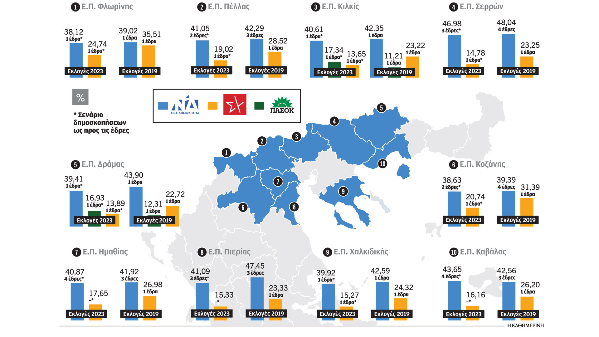 Οι κάλπες της 21ης Μαΐου καθώς και οι δημοσκοπήσεις έκτοτε, ενόψει της αναμέτρησης της ερχόμενης Κυριακής, δείχνουν ότι για πολλούς και διαφορετικούς λόγους η Βόρεια Ελλάδα έχει ιδιαίτερο ενδιαφέρον για μια σειρά από κόμματα. Στο πλαίσιο αυτό, η Μακεδονία βρέθηκε στο επίκεντρο των επιτελείων κατά τον σχεδιασμό της προεκλογικής εκστρατείας τους. Σήμερα εστιάζουμε σε δέκα εκλογικές περιφέρειές της, πλην δηλαδή των δύο μονοεδρικών (Γρεβενά και Καστοριά) που είδαμε στη σχετική ενότητα («Κ» 8/6) και των Α΄ – Β΄ Θεσσαλονίκης με τις οποίες θα ασχοληθούμε αύριο και έχουν ξεχωριστό ενδιαφέρον.