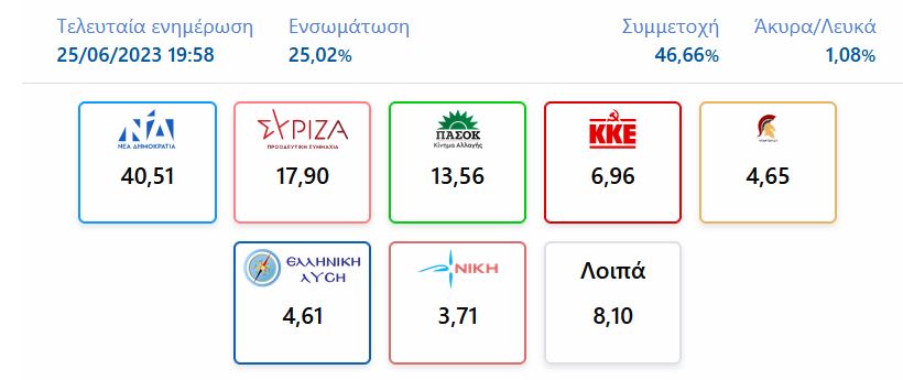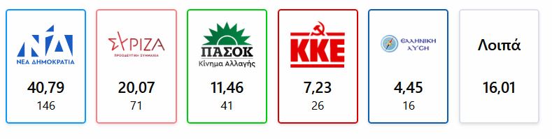 Μεγάλη νίκη για τη ΝΔ με 40,56%, περαιτέρω πτώση για τον ΣΥΡΙΖΑ, που λαμβάνει 17,83% – Η νέα Βουλή θα είναι οκτακομματική: Μπαίνουν Σπαρτιάτες και Νίκη, αλλά και η Πλεύση Ελευθερίας – Οι έδρες των κομμάτων.