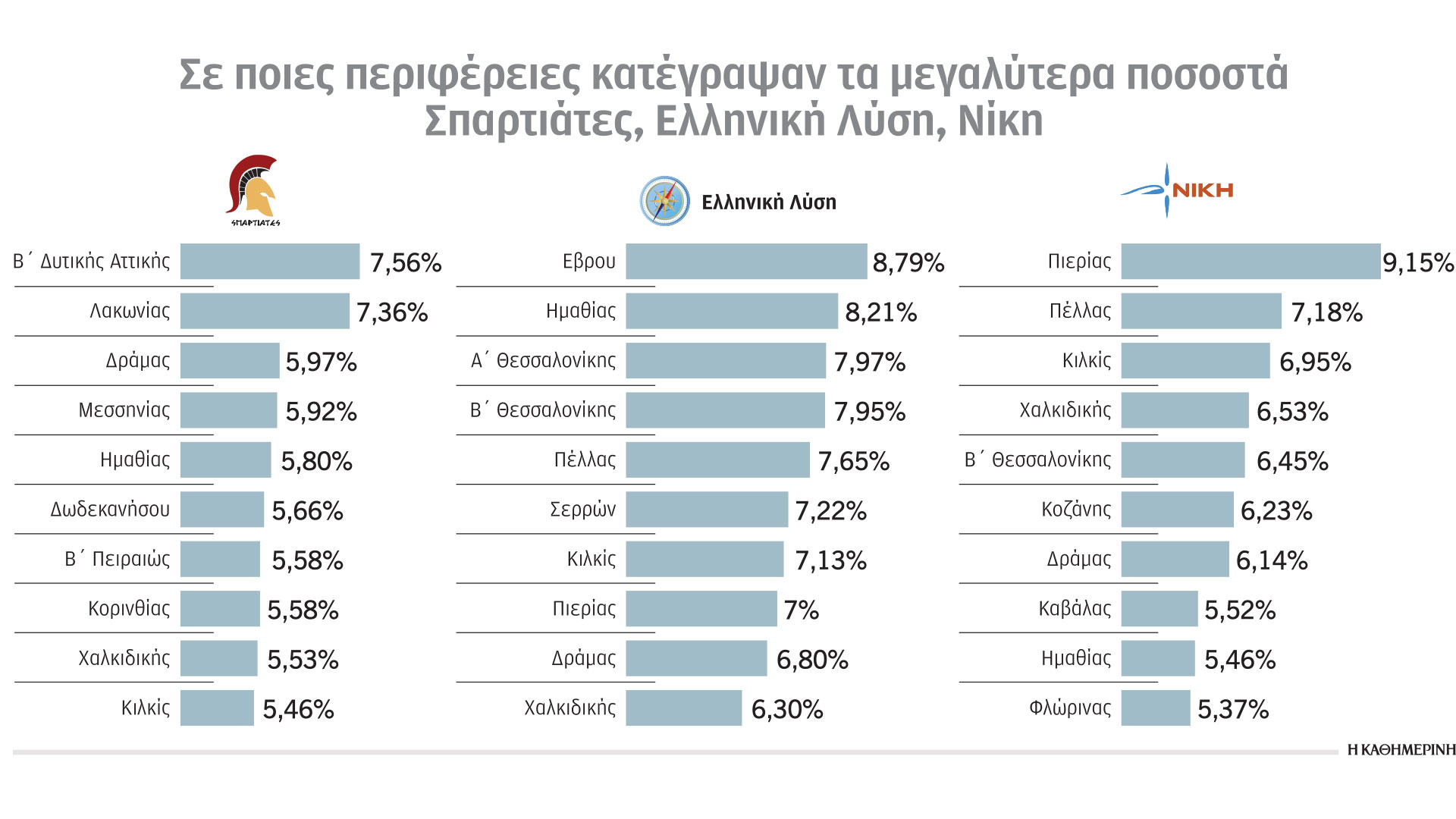 Η Ημαθία είναι η εκλογική περιφέρεια που η Ελληνική Λύση συγκεντρώνει το 2ο μεγαλύτερο ποσοστό της, 8,21% – το πρώτο καλύτερό της είναι στην Περιφέρεια Εβρου, 8,79%. Στην Ημαθία όμως και οι Σπαρτιάτες έχουν 5,80%, ενώ και η Νίκη έλαβε 5,46%. Στο Κιλκίς η Ελληνική Λύση κατέγραψε ποσοστό 7,13%, οι Σπαρτιάτες 5,46% και η Νίκη 6,95%. Επίσης στην εκλογική περιφέρεια της Χαλκιδικής οι Σπαρτιάτες συγκέντρωσαν ποσοστό 5,53% η Ελληνική Λύση 6,30% και η Νίκη 6,53%. Ειδικότερα το μεγαλύτερο ποσοστό για τους Σπαρτιάτες καταγράφηκε στις περιφέρειες Β΄ Δυτικής Αττικής 7,56%, Λακωνίας 7,36%, Δράμας 5,97%, Μεσσηνίας 5,92%, Ημαθίας 5,80%, Δωδεκανήσου 5,66%, Β΄ Πειραιώς 5,58%, Κορινθίας 5,58%, Χαλκιδικής 5,53% και Κιλκίς 5,46%.