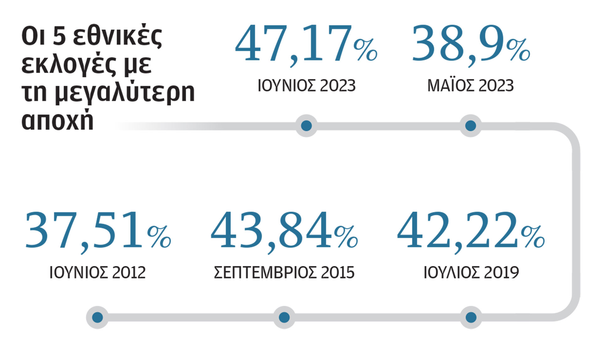Το δυσοίωνο ρεκόρ του ιστορικά υψηλότερου ποσοστού αποχής από τις εθνικές εκλογές καταλαμβάνει πλέον η αναμέτρηση της Κυριακής 25 Ιουνίου 2023. Η αποχή άγγιξε το 47,17%, ξεπερνώντας το προηγούμενο ρεκόρ των εκλογών του Σεπτεμβρίου 2015, όταν η αποχή είχε φθάσει το 43,84%.