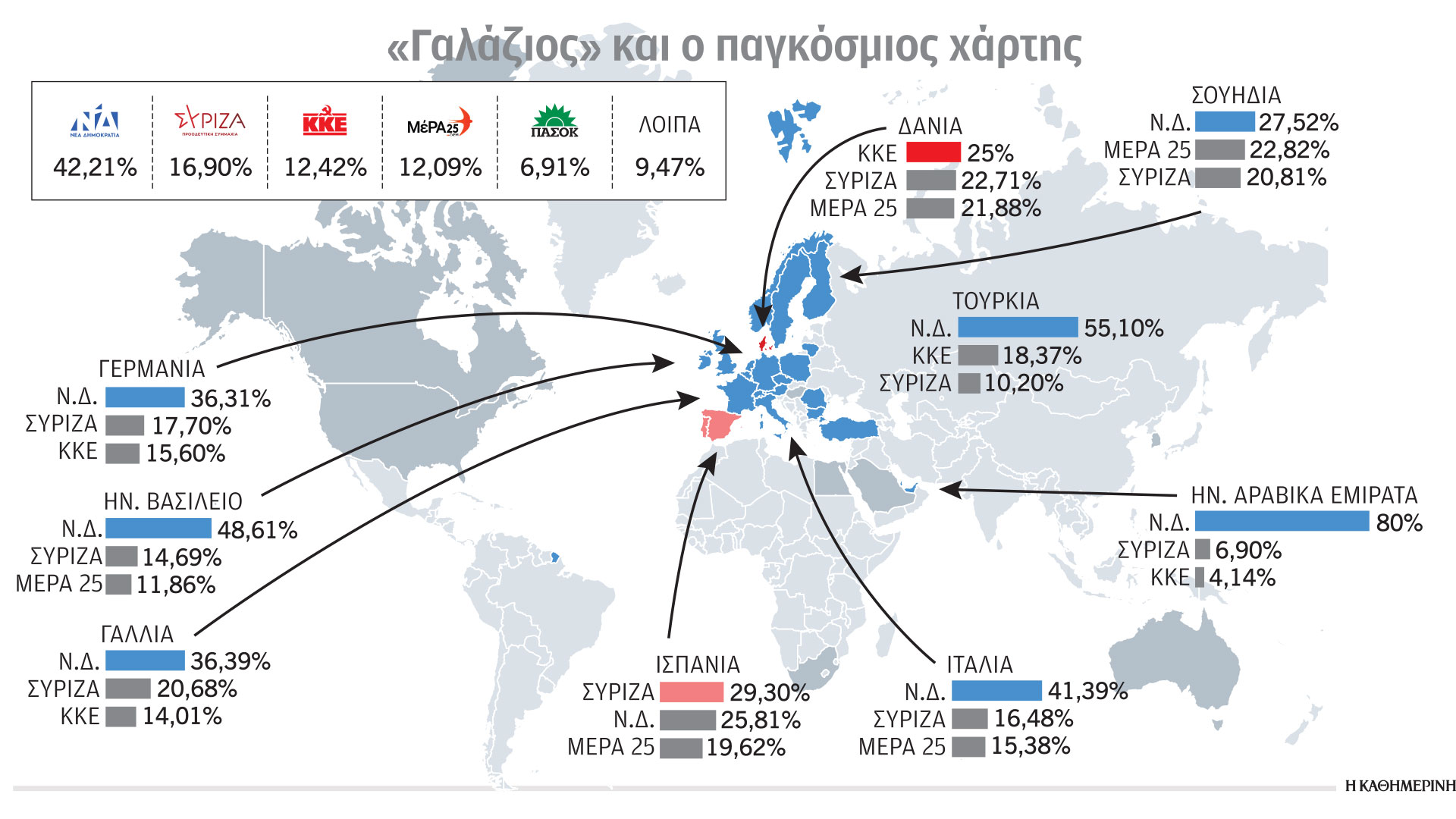 Στη Δανία, τρία κόμματα της Αριστεράς συμπληρώνουν ποσοστό κοντά στο 70%. Συγκεκριμένα, το ΚΚΕ κατέλαβε την πρώτη θέση με ποσοστό 25%, ενώ ο ΣΥΡΙΖΑ βρίσκεται στη δεύτερη θέση με ποσοστό 22,71% και το ΜέΡΑ 25 στην τρίτη με 21,88%, ενώ η Ν.Δ. στους συγκεκριμένους ψηφοφόρους συγκέντρωσε μόλις 14,79%. Σε Πορτογαλία και Ισπανία την πρώτη θέση κατέλαβε ο ΣΥΡΙΖΑ με ποσοστό 33,33% και 29,30% αντίστοιχα. Ωστόσο, ο ΣΥΡΙΖΑ έχασε σε αυτές τις εκλογές την πρωτιά στη Σουηδία, την οποία είχε επιτύχει μόλις πριν από έναν μήνα, σημειώνοντας ποσοστό 26,56%.