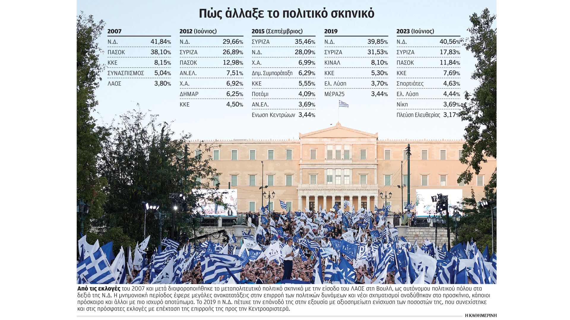 Μια διαχρονική ανάγνωση των εκλογικών αποτελεσμάτων της Μεταπολίτευσης δείχνει ότι βρισκόμαστε σε νέα δεδομένα μετά την τελευταία εκλογική αναμέτρηση. Από το 1974 και μετά, μέχρι και τις εκλογές του 2004, φαίνεται να υπάρχει μια απόλυτη ισορροπία στο πολιτικό φάσμα. Με τις δυνάμεις της Αριστεράς να διατηρούν έναν μάλλον περιχαρακωμένο χώρο πολιτικής επιρροής και Ν.Δ. και ΠΑΣΟΚ να κερδίζουν τις εκλογικές αναμετρήσεις ανάλογα με το ποιο από τα δύο κόμματα καταφέρνει να αυξήσει την επιρροή του προς το Κέντρο, πιέζοντας τα ποσοστά του αντιπάλου. Εξαίρεση σε αυτή την περίοδο σημειώθηκε στις εκλογές του 1993, όταν η εμφάνιση της Πολιτικής Ανοιξης διατάραξε τις ισορροπίες. Από το 2007 και μετά, όμως, η εικόνα αλλάζει, καθώς τότε καταφέρνει να εξασφαλίσει την είσοδό του στη Βουλή ο ΛΑΟΣ του Γιώργου Καρατζαφέρη, με τον χώρο στα δεξιά της Ν.Δ. να αποκτά αυτόνομη κοινοβουλευτική παρουσία, κάτι που επαναλαμβάνεται και το 2009.