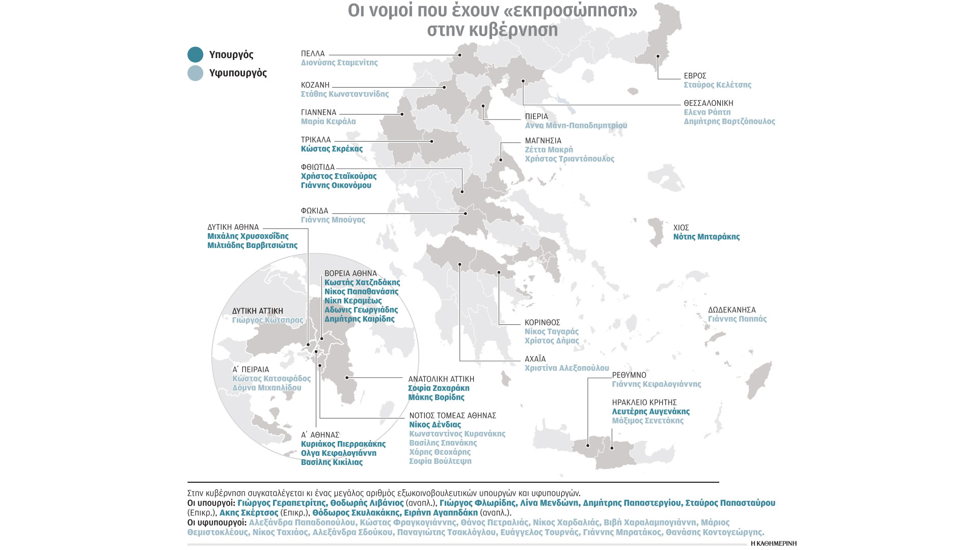 Ο Κυριάκος Μητσοτάκης το είχε προαναγγείλει πριν από τις εκλογές, πως στα κριτήριά του για τον σχηματισμό κυβέρνησης δεν θα συμπεριλαμβάνονται ούτε οι σταυροί προτίμησης ούτε κάποιος γεωγραφικός προσδιορισμός. Η ανάλυση των υπουργοποιήσεων ανά νομό αποδεικνύει πως ο πρωθυπουργός έκανε πράξη τα όσα έλεγε, καθώς δεν υπάρχει κάποια «ομοιόμορφη» κατανομή με βάση τη γεωγραφία, επιλέγοντας στελέχη με βάση το κατά πόσο θεωρεί πως μπορούν να φέρουν εις πέρας τη δουλειά που τους αναθέτει. Χαρακτηριστικό είναι πως η Λάρισα και η Αιτωλοακαρνανία, ο πέμπτος και ο έκτος μεγαλύτερος νομός της χώρας αντίστοιχα, δεν έχουν εκπρόσωπο στην κυβέρνηση, ενώ η Λακωνία, ο νομός με το υψηλότερο ποσοστό της Ν.Δ. και το δεύτερο υψηλότερο των Σπαρτιατών πανελλαδικά δεν έχει υπουργό ή υφυπουργό, ενώ όλη η Πελοπόννησος εκπροσωπείται μόνο από την Κορινθία, με δύο μάλιστα υφυπουργούς. Αντίστοιχα υπάρχουν και άλλοι νομοί που έχουν δύο μέλη στην κυβέρνηση, όπως η Μαγνησία και το Ηράκλειο, ενώ άλλοι δεν είδαν να υπουργοποιούνται βουλευτές τους, όπως ο νομός Ηλείας.