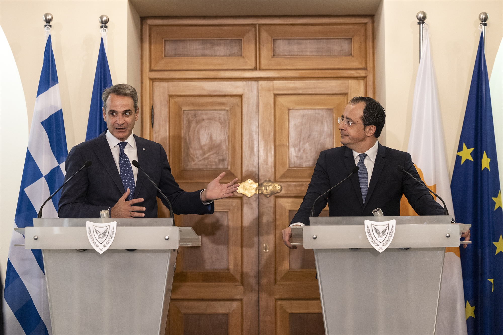 Χθες, πάντως, στη Λευκωσία ο κ. Μητσοτάκης σημείωσε ότι Ελλάδα και Κυπριακή Δημοκρατία «συνεχίζουν σε απόλυτο συντονισμό σε επίπεδο Ε.Ε., Ηνωμένων Εθνών και στο επίπεδο διμερών και πολυμερών επαφών μας να διεκδικούμε μια δίκαιη και αμοιβαία αποδεκτή λύση, διζωνικής δικοινοτικής ομοσπονδίας πάντα στο πλαίσιο των αποφάσεων του ΟΗΕ. Αυτές οι αποφάσεις ήταν, είναι και θα παραμείνουν ο οδηγός μας. Στον 21ο αιώνα δεν γίνεται να παραμένει ανοιχτή αυτή η ιστορική πληγή που εξακολουθεί να αιμορραγεί σε μια ανεξάρτητη χώρα. Δεν μπορεί να είναι ανεκτή ούτε η παρουσία κατοχικού στρατού σε ένα κράτος-μέλος της Ε.Ε., ούτε το ξεπερασμένο σύστημα των εγγυήσεων του δικαιώματος επέμβασης τρίτων στις υποθέσεις του. Γι’ αυτό και είναι εκτός ατζέντας συζήτησης κάθε διχοτομική σκέψη περί δύο κρατών». Ο κ. Χριστοδουλίδης από την πλευρά του ουσιαστικά διέψευσε τις φήμες περί προβλημάτων στη σχέση με τον πρωθυπουργό λέγοντας, μεταξύ άλλων, ότι «όσο κι αν κάποιοι είτε στην Αθήνα είτε στη Λευκωσία “βλέπουν” για δικούς τους λόγους διαφορές μεταξύ μας, οι στόχοι και οι επιδιώξεις μας είναι κοινοί, όπως και ο τρόπος και τα μέσα για να πετύχουμε τους στόχους. Παρακολουθούμε με ενδιαφέρον τις εξελίξεις στην Τουρκία μετά τις εκλογές και καλωσορίζουμε τις δημόσιες τοποθετήσεις της Αγκυρας για την επιθυμία ενίσχυσης των ευρωτουρκικών σχέσεων». Ο κ. Χριστοδουλίδης σημείωσε, ακόμη, ότι η Ε.Ε. «είναι απόλυτα δεσμευμένη και έτοιμη να συμβάλει ενεργά σε όλα τα στάδια της διαδικασίας και με όλα τα μέσα που έχει στη διάθεσή της, ενώ εκφράζει την ετοιμότητα για επανεκκίνηση των σχέσεων με την Τουρκία, πάντα στη βάση του υφιστάμενου πλαισίου και της αιρεσιμότητας».