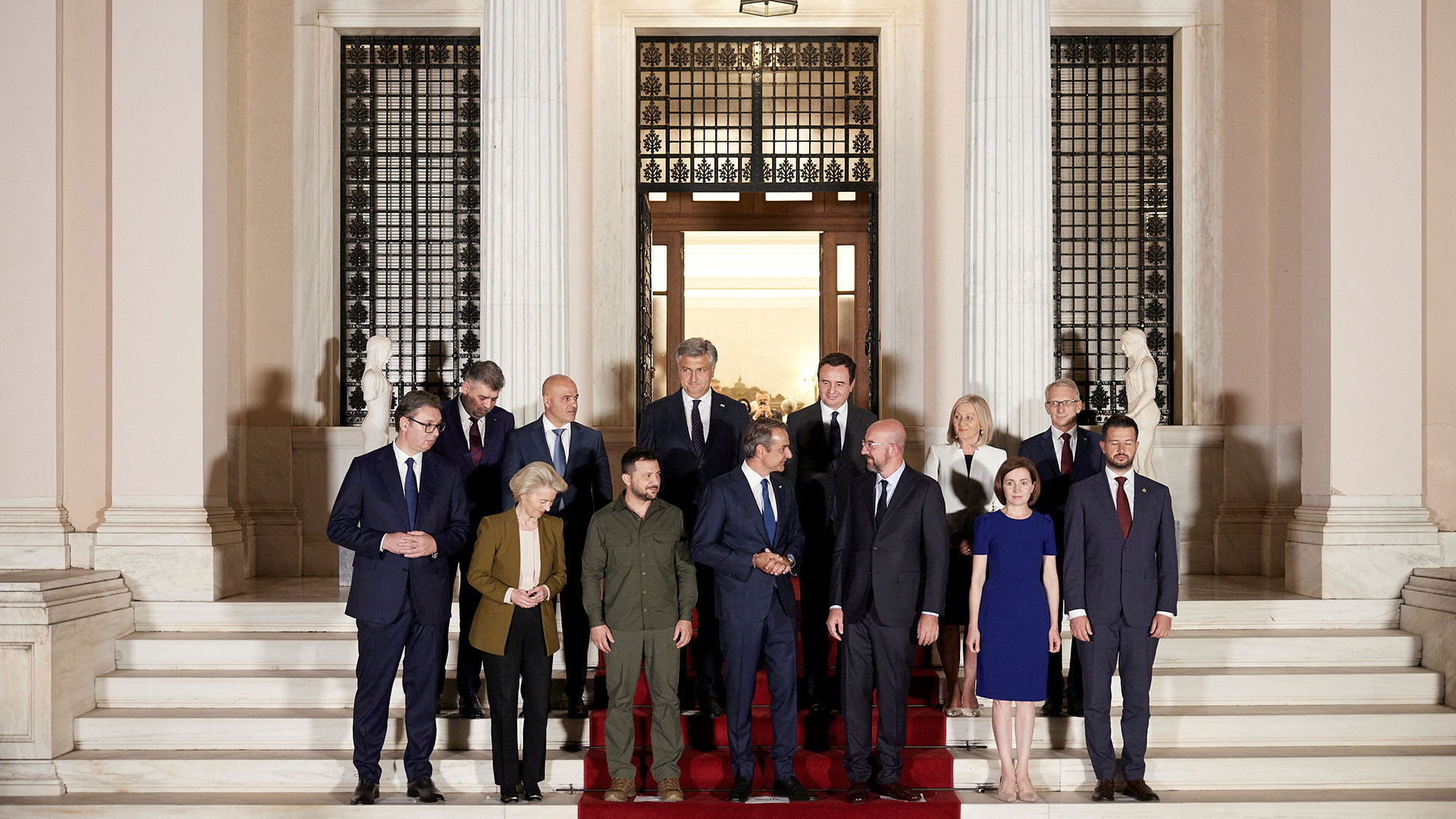 «Εμείς ο Πρόεδρος Aleksandar Vučić, η Πρόεδρος Maia Sandu, ο Πρόεδρος Volodymyr Zelenskyy, ο Πρόεδρος Jakov Milatović, ο Πρωθυπουργός Κυριάκος Μητσοτάκης, ο Πρωθυπουργός Ion-Marcel Ciolacu, ο Πρωθυπουργός Albin Kurti, η Πρόεδρος του Υπουργικού Συμβουλίου Borjana Krišto, ο Πρωθυπουργός Dimitar Kovachevski, ο Πρωθυπουργός Nikolai Denkov, και ο Πρωθυπουργός Andrej Plenković, παρουσία του Προέδρου του Ευρωπαϊκού Συμβουλίου και του Προέδρου της Ευρωπαϊκής Επιτροπής, συναντήθηκαν σήμερα στην Αθήνα, είκοσι χρόνια μετά την ιστορική Σύνοδο Κορυφής ΕΕ-Δυτικών Βαλκανίων στη Θεσσαλονίκη, και εξέδωσαν την ακόλουθη δήλωση: