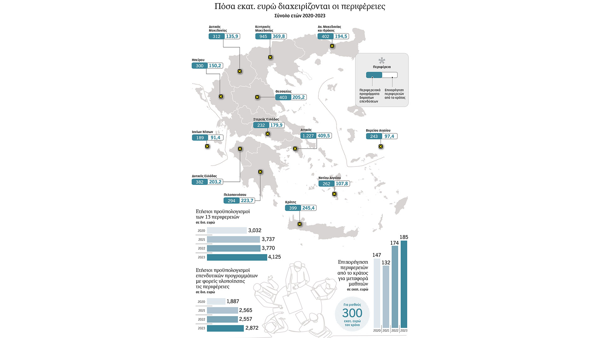 Τα οικονομικά στοιχεία που δημοσιεύει η «Κ» δείχνουν ότι οι 13 περιφέρειες της χώρας διαχειρίζονται μεγάλα κονδύλια, τόσο από τον κρατικό προϋπολογισμό όσο και από ευρωπαϊκά προγράμματα, ωστόσο για πολλά από αυτά παραμένουν απλώς «μεσάζοντες». Τα εισπράττουν και τα κατανέμουν σε φορείς και δικαιούχους, διατηρώντας κατά βάση την ισχύ αυτού που μοιράζει τα κονδύλια, αλλά καμία επί της ουσίας αρμοδιότητα. Αντίστοιχα, είναι υπεύθυνες για υποδομές στις περιφέρειες, για τις οποίες δεν έχουν τα κονδύλια και την αναγκαία οργάνωση να συντηρήσουν. Η τοπική αυτοδιοίκηση, μετά δεκαετίες μεγαλόπνοων εξαγγελιών για την ανάγκη αποκέντρωσης, παραμένει δέσμια του κεντρικού κράτους. Το γεγονός αυτό γεννάει πολλά προβλήματα, τα οποία έχουν άμεσες συνέπειες στη ζωή αλλά και στην ασφάλεια των πολιτών.