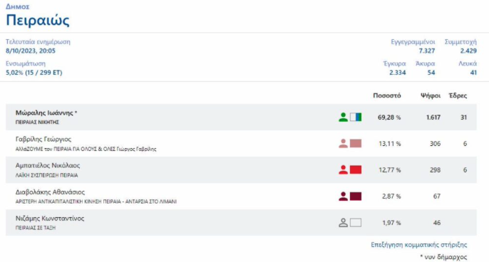 - 20:19Επικράτηση Μώραλη δείχνουν τα πρώτα αποτελέσματα στον Πειραιά (Ενσωμάτωση 5,02%)