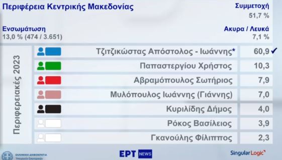 - 20:14Περιφέρεια Κεντρικής Μακεδονίας: Καθαρή νίκη Τζιτζικώστα με ενσωμάτωση στο 5,72%