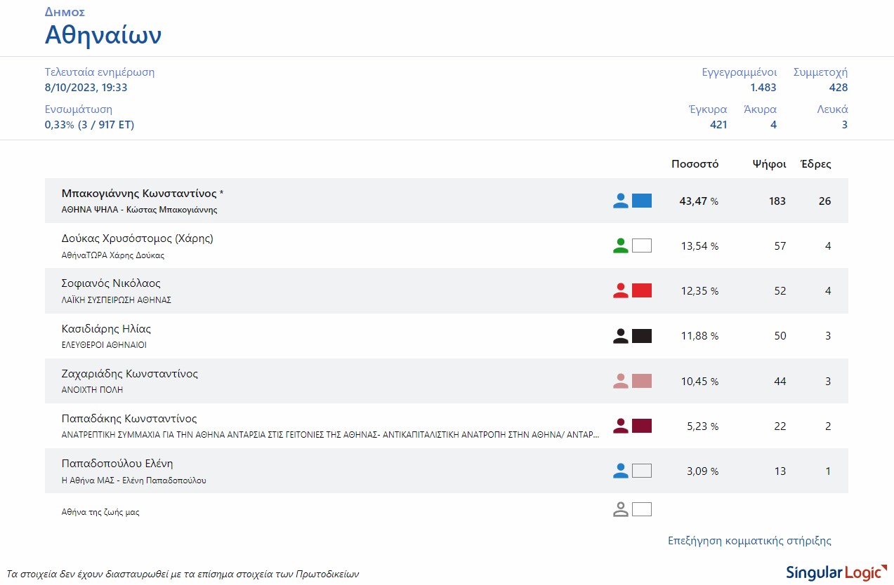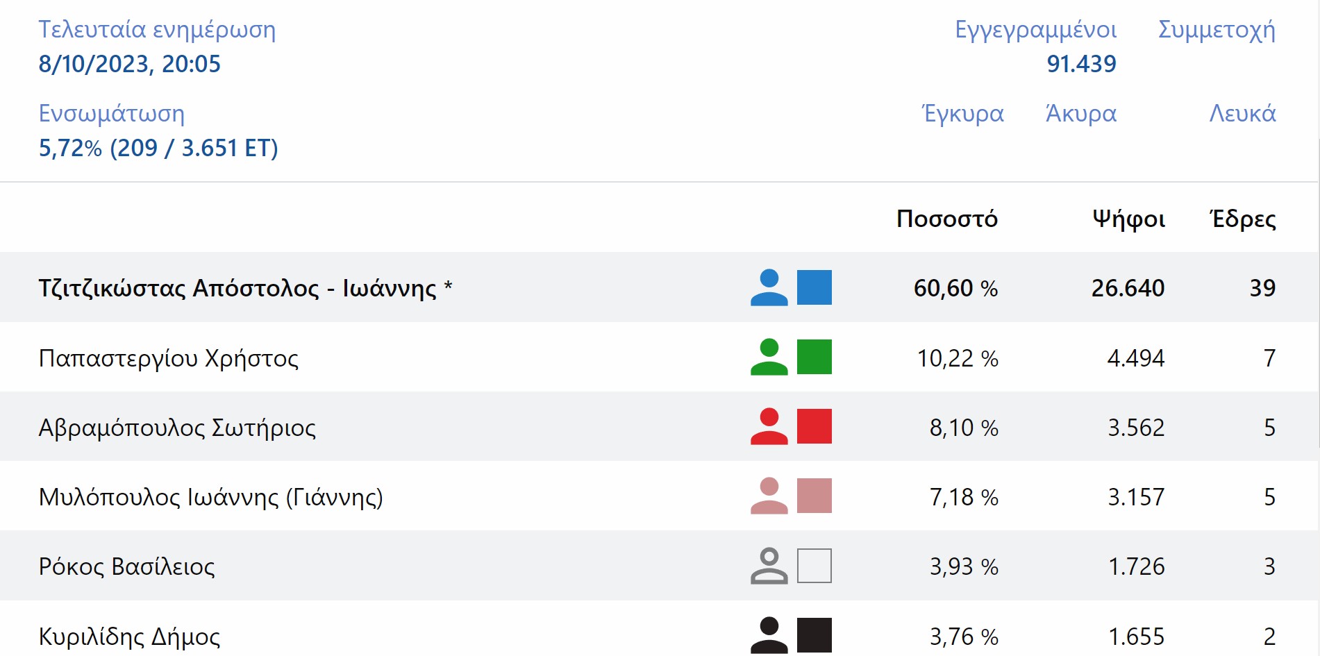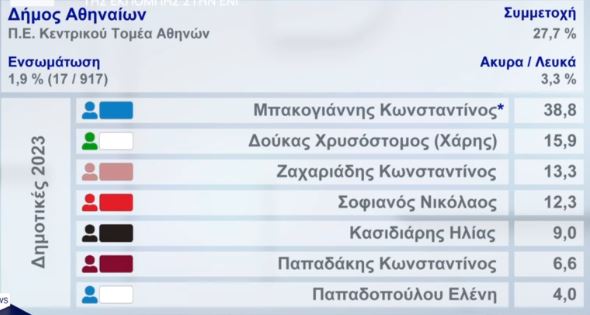 - 19:57Δήμος Αθηναίων ενσωμάτωση στο 3,6%: