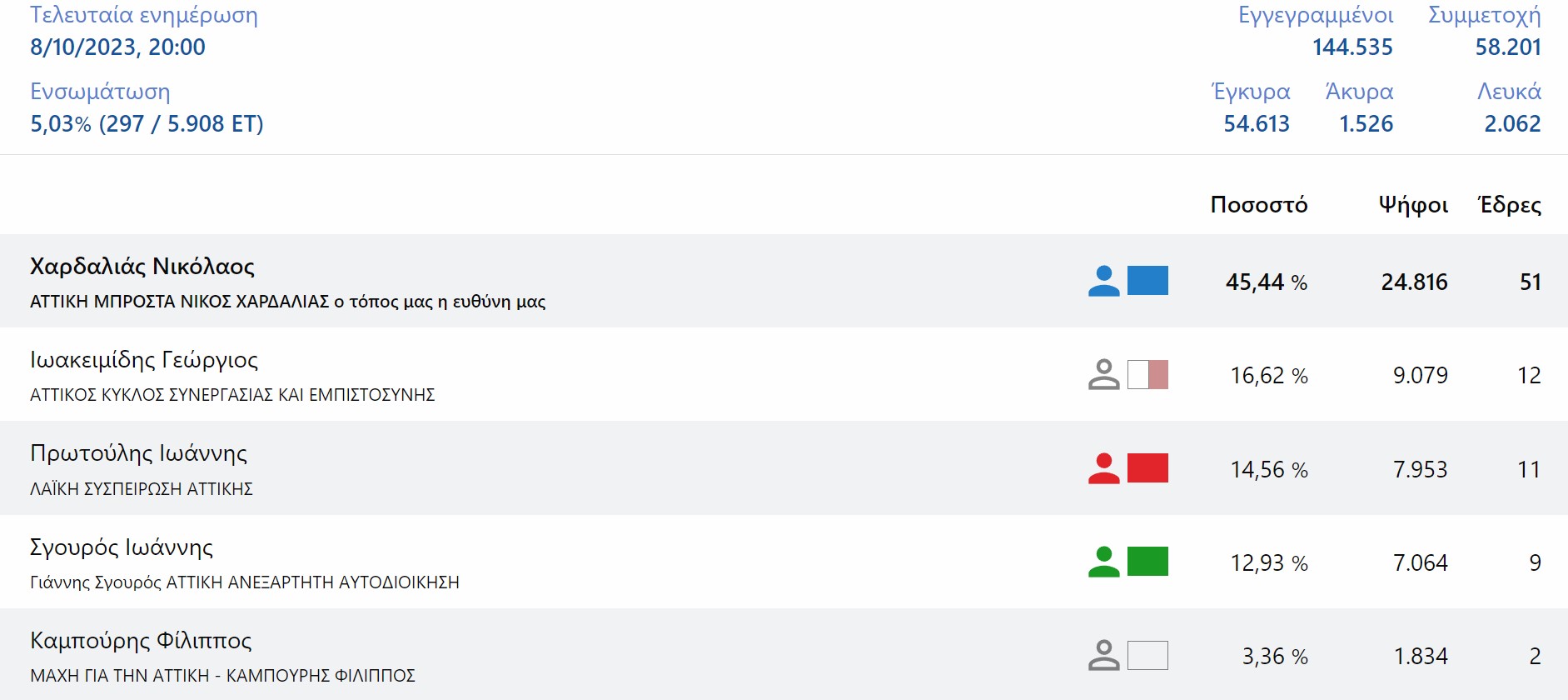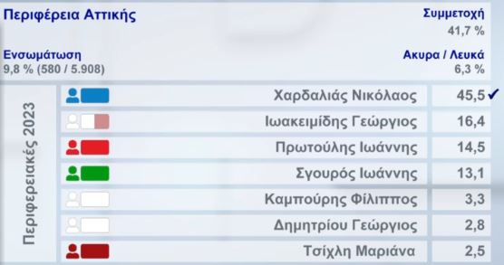 - 20:09Περιφέρεια Αττικής: Μεγάλο προβάδισμα Χαρδαλιά με ενσωμάτωση στο 5%
