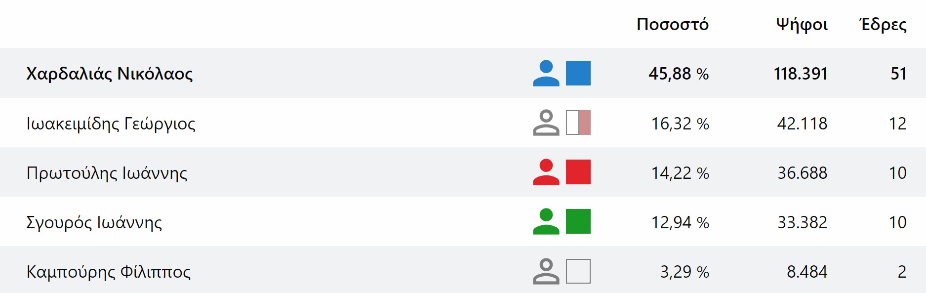 - 20:58Νίκη Χαρδαλιά από τον α' γύρο στην Περιφέρεια Αττικής, σύμφωνα με τα αποτελέσματα με ενσωμάτωση στο 22,1%