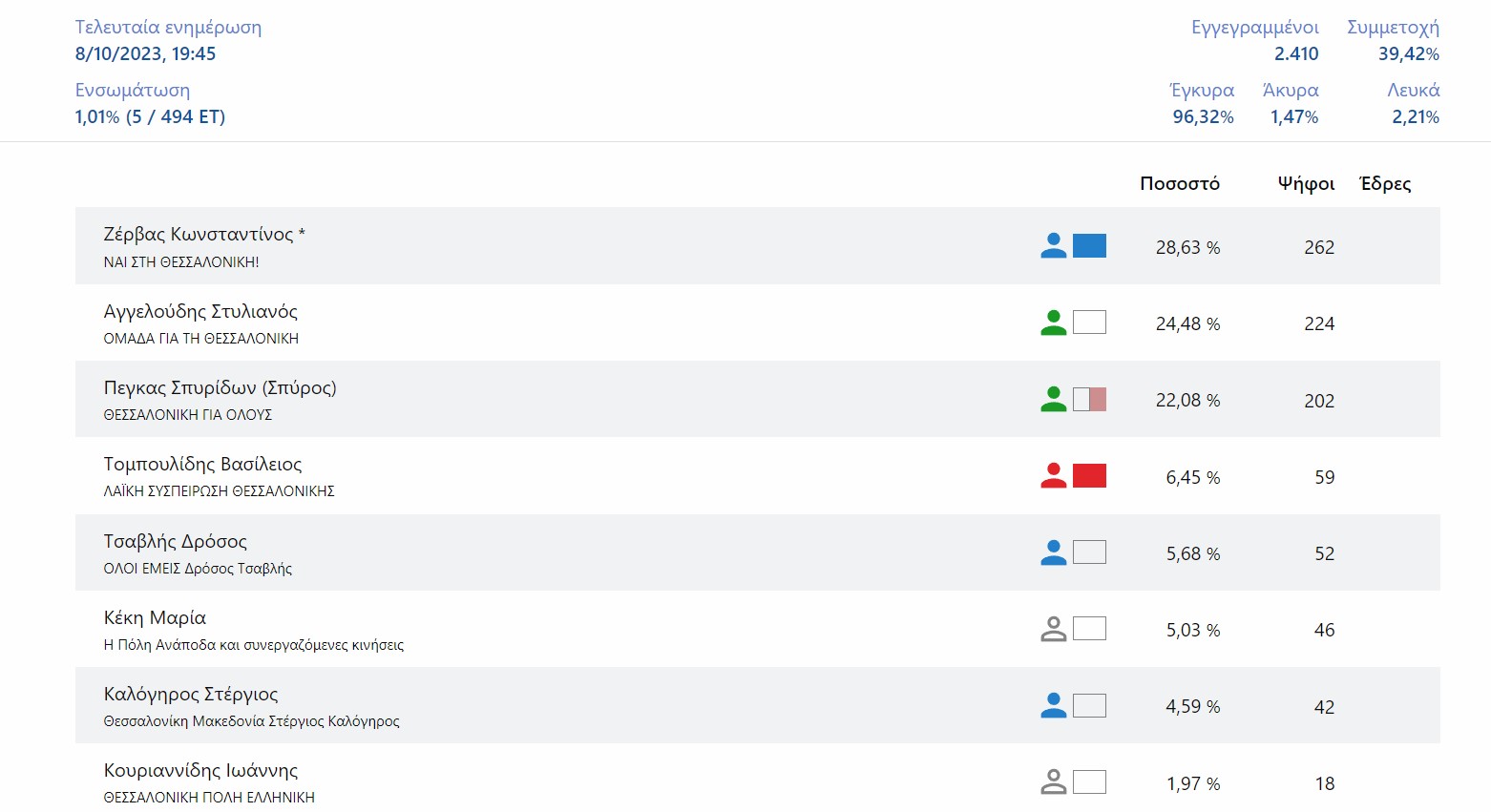 - 20:39Δήμος Θεσσαλονίκης: Μάχη Ζέρβα-Αγγελούδη στον β' γύρο, σύμφωνα με τα αποτελέσματα στο 8,9% της ενσωμάτωσης