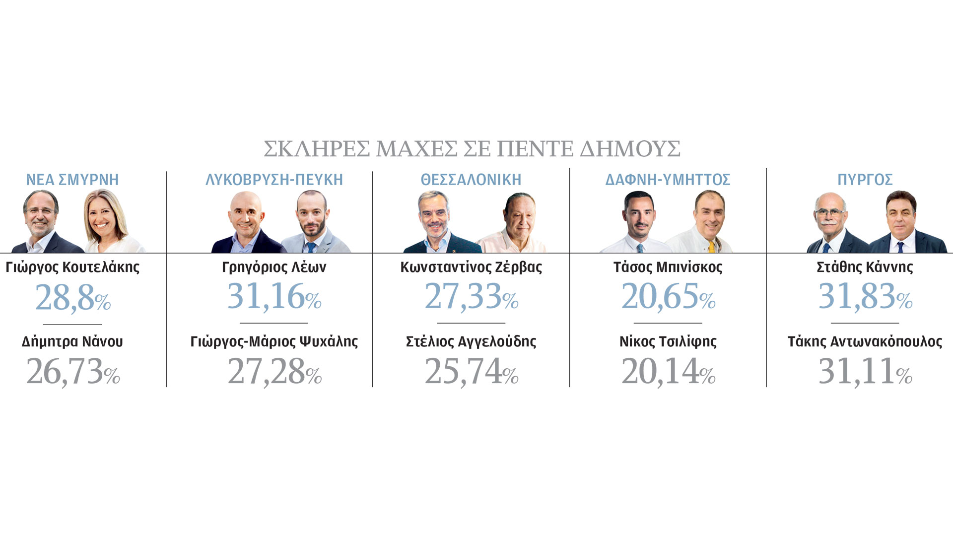 Για παράδειγμα, μπορεί να υπάρχει υποψήφιος δήμαρχος που προέρχεται από το ΠΑΣΟΚ και να έχει ψηφοδέλτιο κατά 80% με στελέχη της Ν.Δ. ή να στηρίζεται από δύο ή περισσότερα κόμματα. Η «Κ» αποκρυπτογραφεί αυτή την περίπλοκη κατάσταση και παρουσιάζει τη μάχη του δεύτερου γύρου.