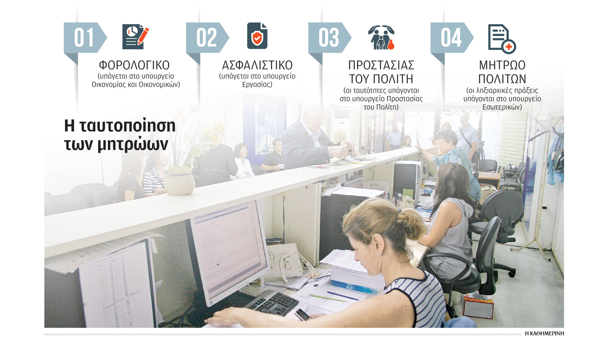 Στο ένα μητρώο είσαι παντρεμένος με παιδί. Στο άλλο, που είναι ακόμη από την περίοδο που ήσουν φοιτητής, είσαι εργένης. Σε κάποιο άλλο σε έχουν γράψει Κωνσταντίνο και σε άλλο Κωστή ή αντίστοιχα αλλού σε λένε Σταματία και αλλού Σταματίνα, καθώς ξέφυγε ένα «ν». Σε άλλο μητρώο μένεις στο Παγκράτι και σε άλλο στον Βόλο. Τα παιδιά που έκανες από τον πρώτο σου γάμο «χρεώνονται» στον δεύτερο γάμο και η μητέρα τους είναι ξαφνικά αόρατη, ενώ ο γιος σου παρότι πάει Δημοτικό είναι ακόμη «άρρεν», γιατί δεν πέρασε η βάπτισή του σε όλα τα μητρώα. Τα παραπάνω είναι μόνο μερικά προβλήματα που αντιμετωπίζει σχεδόν κάθε ελληνικό σπίτι από τις πολλές εγγραφές των Ελλήνων πολιτών στα τέσσερα συνολικά μητρώα που υπάρχουν: α) το φορολογικό, β) το ασφαλιστικό, γ) το Προστασίας του Πολίτη που έχει να κάνει με τις ταυτότητες και δ) το γενικό μητρώο πολιτών. Σημαντική σημείωση: το κάθε ένα από τα παραπάνω μητρώα υπάγεται σε… διαφορετικό υπουργείο. Το φορολογικό στο Εθνικής Οικονομίας και Οικονομικών, το Ασφαλιστικό στο Εργασίας, οι ταυτότητες στο Προστασίας του Πολίτη και το μητρώο πολιτών –οι ληξιαρχικές πράξεις δηλαδή– στο υπουργείο Εσωτερικών.