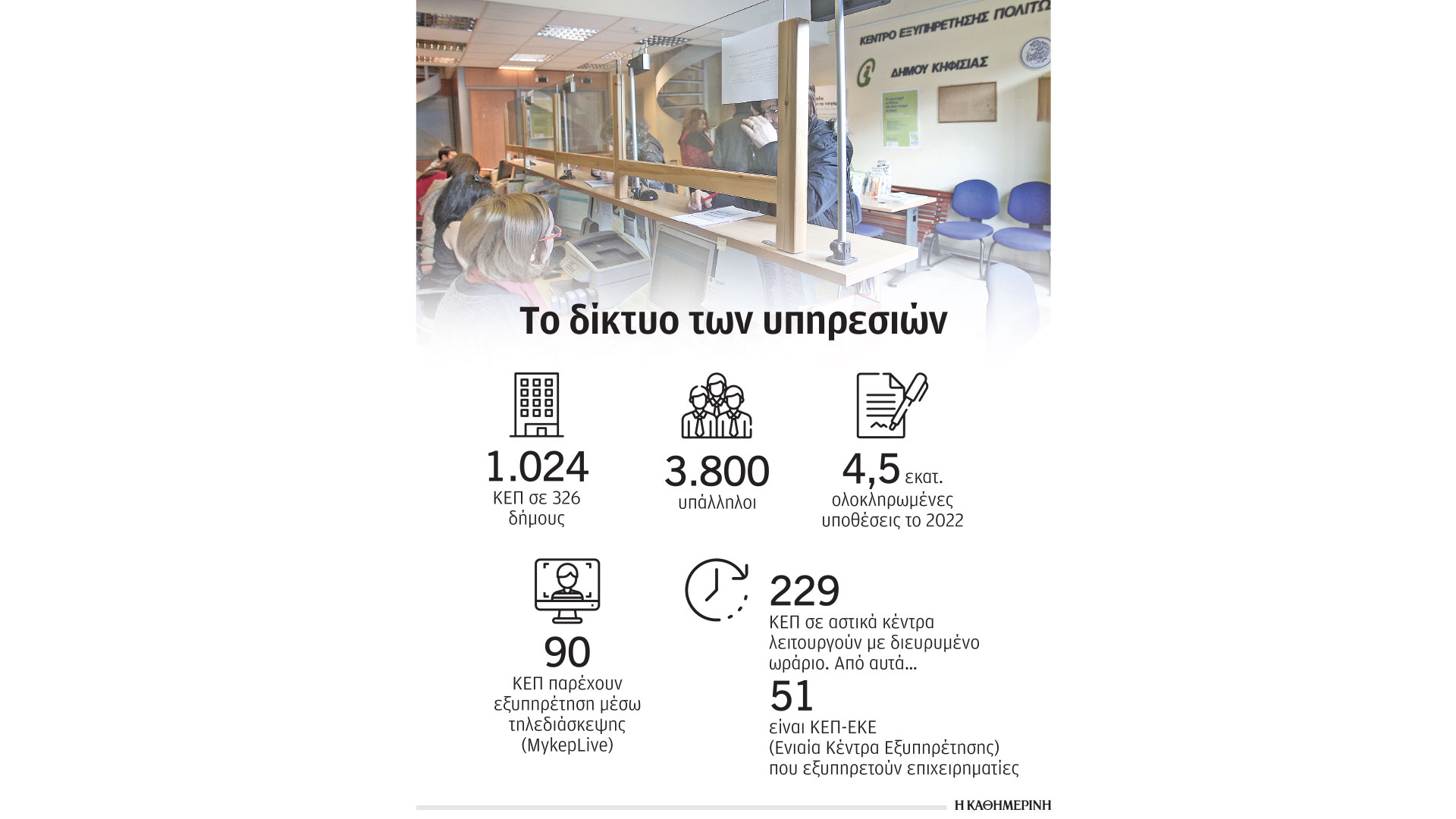 Παράλληλα στα ΚΕΠ θα μπορούν να διεκπεραιώνονται θέματα που έχουν σχέση με την πολεοδομία –σήμερα δεν γίνεται–, ενώ σχεδιάζεται να δημιουργηθεί «φάκελος» κάθε πολίτη που θα περιλαμβάνει όλα τα δικαιολογητικά και έγγραφα που τον αφορούν και τα οποία θα αντλούνται ψηφιακά αυτεπαγγέλτως, μέσω της διαλειτουργικότητας με τα άλλα συστήματα του Δημοσίου.