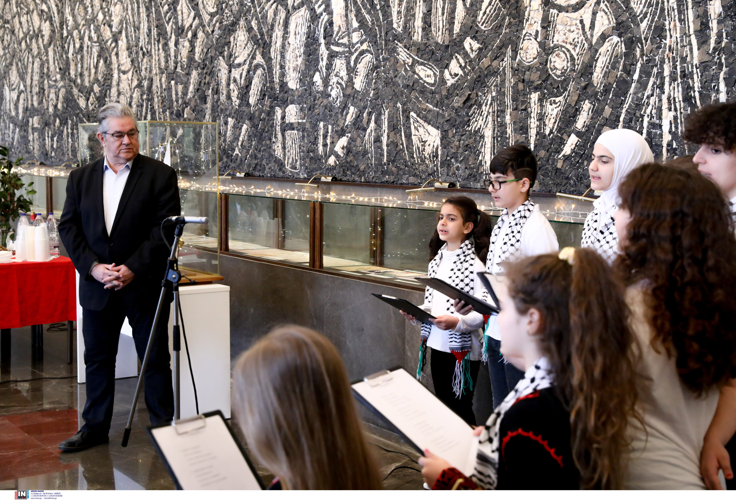 Στην έδρα της Κ.Ε. του ΚΚΕ στον Περισσό, ο γ.γ. της Κ.Ε. του κόμματος, Δημήτρης Κουτσούμπας, άκουσε λίγο πριν από το μεσημέρι τα πρωτοχρονιάτικα κάλαντα από την παιδική χορωδία της Παλαιστινιακής Παροικίας Ελλάδας.