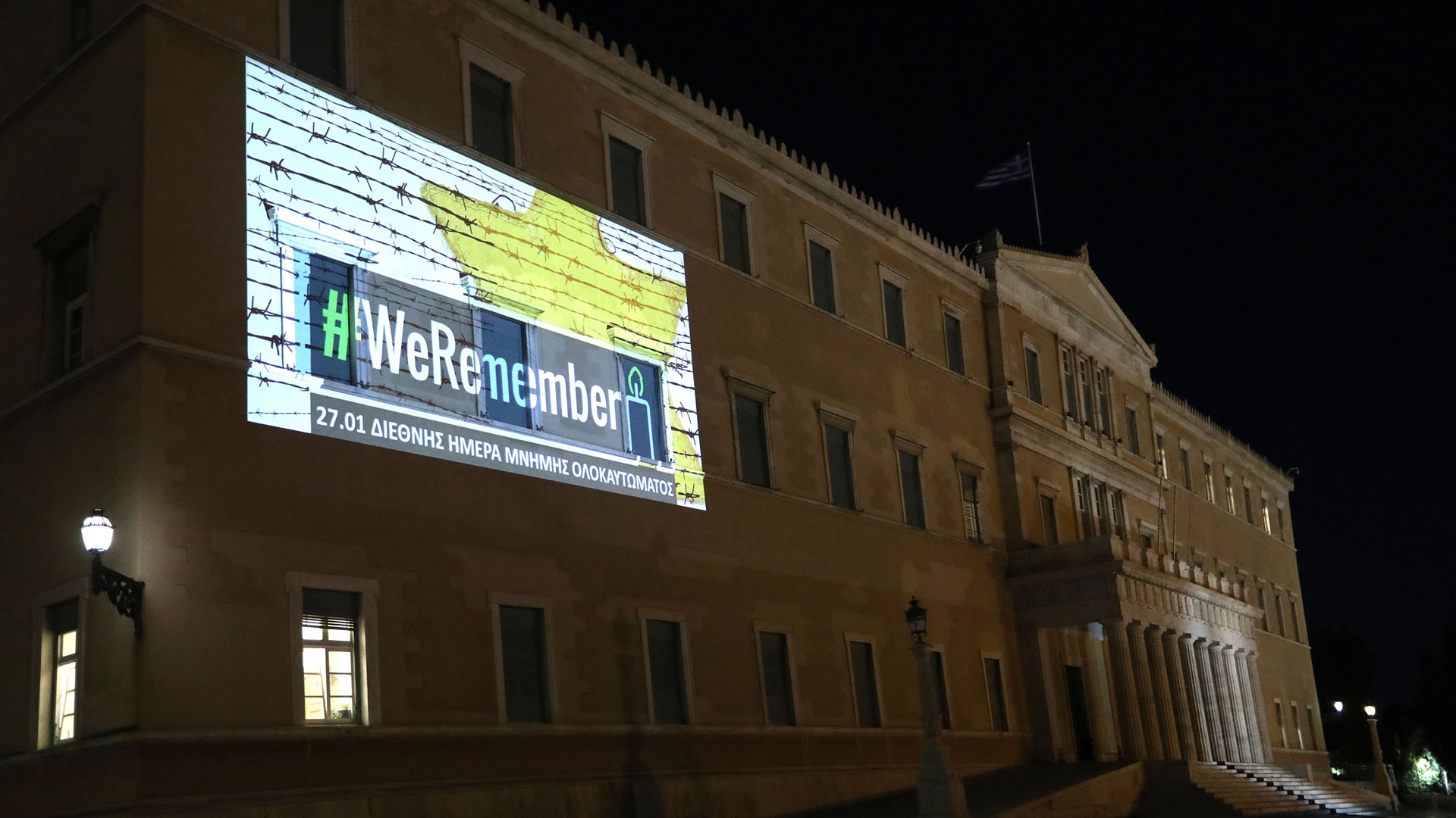 Με το σύνθημα #WeRemember φωταγωγήθηκε την Παρασκευή η πρόσοψη του κτιρίου της Βουλής, στο πλαίσιο των παγκόσμιων εκδηλώσεων που πραγματοποιούνται για τη Διεθνή Ημέρα Μνήμης των Θυμάτων του Ολοκαυτώματος.