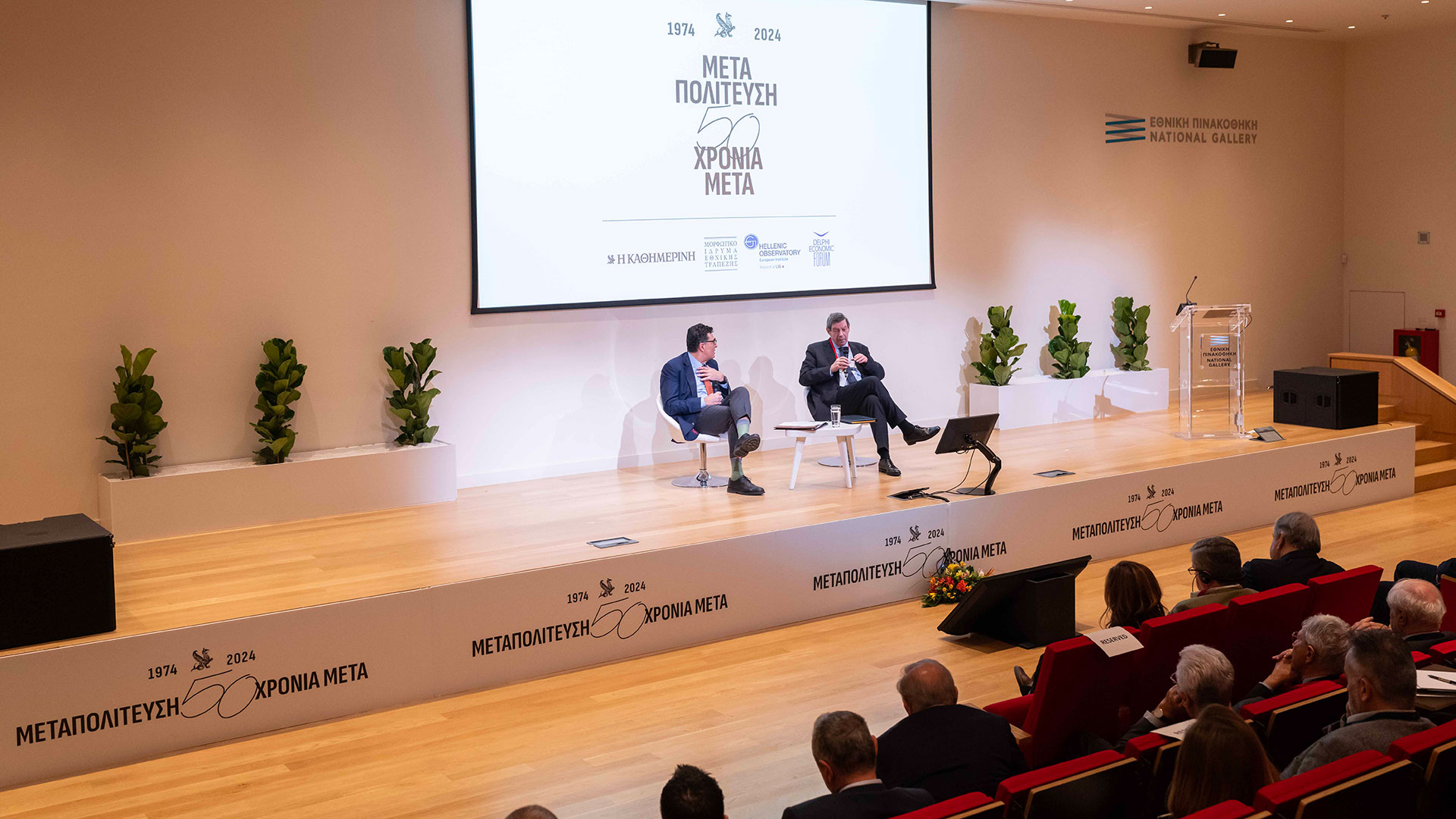 Στη συζήτηση που ακολούθησε ανάμεσα στον καθηγητή Οικονομικής και Κοινωνικής Ιστορίας του ΕΚΠΑ και διευθυντή του Μορφωτικού Ιδρύματος της Εθνικής Τραπέζης Κώστα Κωστή και τον Αλέξη Παπαχελά, για την πορεία της Δημοκρατίας τα 50 χρόνια που μεσολάβησαν, ο κ. Κωστής μοιράστηκε την πεποίθηση που επικρατούσε τα πρώτα χρόνια μετά την πτώση της δικτατορίας, σύμφωνα με την οποία «η χώρα θα μπορούσε να αλλάξει προς μια κατεύθυνση που σήμερα θα τη θεωρούσαμε, ενδεχομένως, ουτοπική». Επισήμανε επίσης ότι «το 1974 η δημοκρατία έρχεται μέσα από μια μεγάλη καταστροφή. Στην Ελλάδα αγνοούμε το τι ακριβώς συνέβη. Αγνοούμε την Κύπρο και αγνοούμε επίσης πως ό,τι συνέβη στην Κύπρο οφείλεται στην Ελλάδα». Ο κ. Παπαχελάς παρατήρησε, πάντως, ότι «είχαμε μια ομαλή μετάβαση στη δημοκρατία, χωρίς περιπέτειες. Είχαμε τρομοκρατία, είχαμε αίμα, είχαμε στιγμές πόλωσης και μεγάλου διχασμού, όμως η δημοκρατία πάντα άντεξε στο τέλος». «Αυτό θα μπορούσαμε να το αποδώσουμε στον Κωνσταντίνο Καραμανλή», επισήμανε ο κ. Κωστής. «Είναι εκείνος που διαμορφώνει τον αρχικό πυρήνα του δημοκρατικού μας καθεστώτος. Αυτό πρέπει να το αναγνωρίζουμε πάντα». Σε κάθε περίπτωση, ο κ. Παπαχελάς μίλησε συνολικά για «υπερδικαιωματισμό και διαζύγιο με το αυτονόητο» ως χαρακτηριστικά που σημάδεψαν διάφορες φάσεις της μεταπολιτευτικής περιόδου. «Οι προσδοκίες οδήγησαν σε δαπάνες (…) Η οικονομία υποτάχθηκε στην πολιτική», σχολίασε μεταξύ άλλων ο κ. Κωστής.