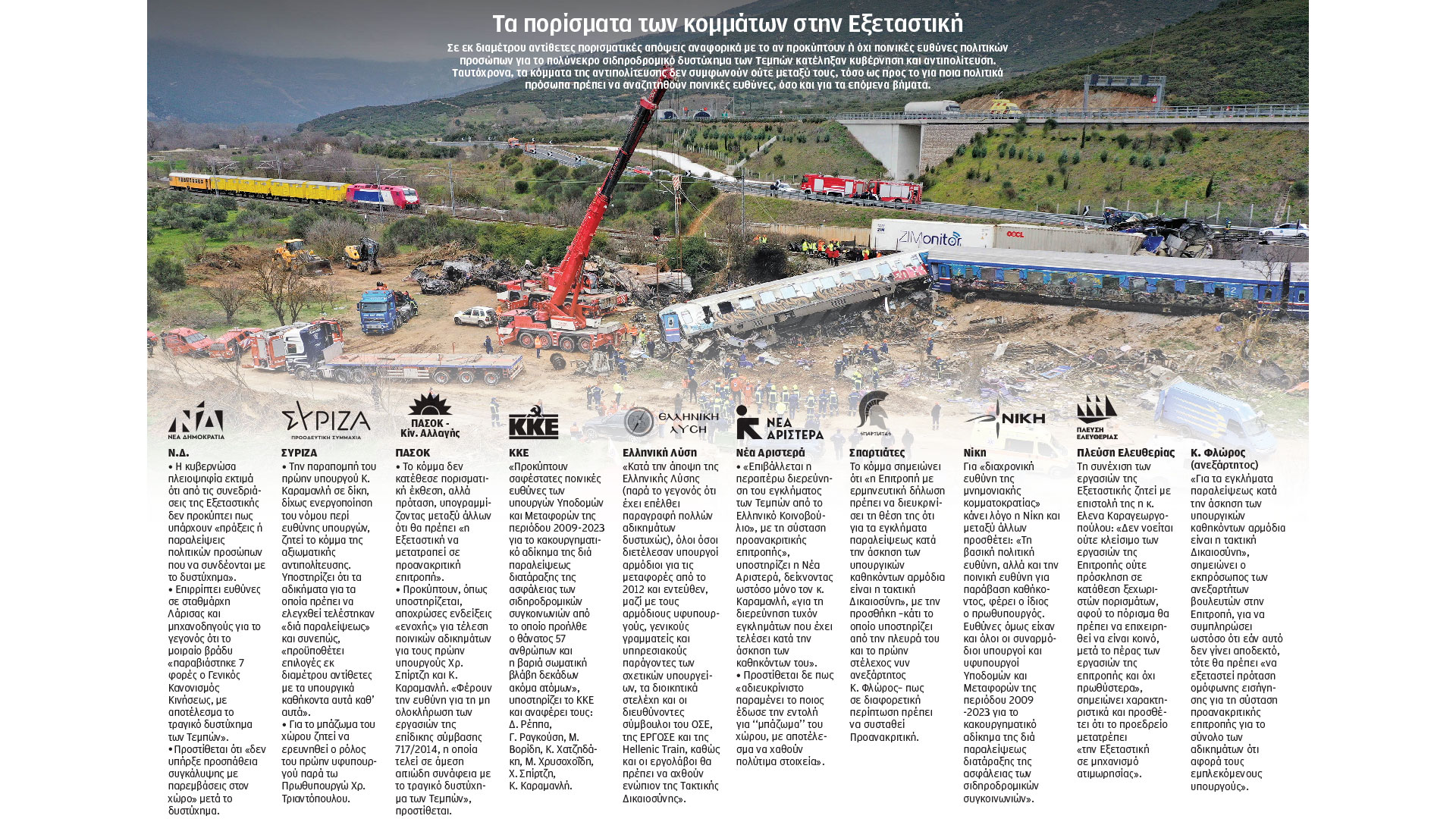 Από την πλευρά του ο πρόεδρος του ΣΥΡΙΖΑ Στ. Κασσελάκης με ανάρτησή του στα μέσα κοινωνικής δικτύωσης μεταξύ άλλων τόνιζε: «Η έγνοια του Κυρ. Μητσοτάκη ήταν στο πώς θα κλείσει άρον άρον τις εργασίες της εξεταστικής επιτροπής της Βουλής, πώς θα συγκαλύψει το έγκλημα των Τεμπών. Ο πρωθυπουργός φέρει βαρύτατες πολιτικές ευθύνες για την απώλεια 57 ανθρώπων, που χάθηκαν επειδή δεν υπήρχε σύστημα σηματοδότησης – τηλεδιοίκησης μετά το 2019. Εχει όμως την αποκλειστική ευθύνη για τη συγκάλυψη του εγκλήματος. Τσιμέντο στον τόπο του εγκλήματος, τσιμέντο και στις ευθύνες».