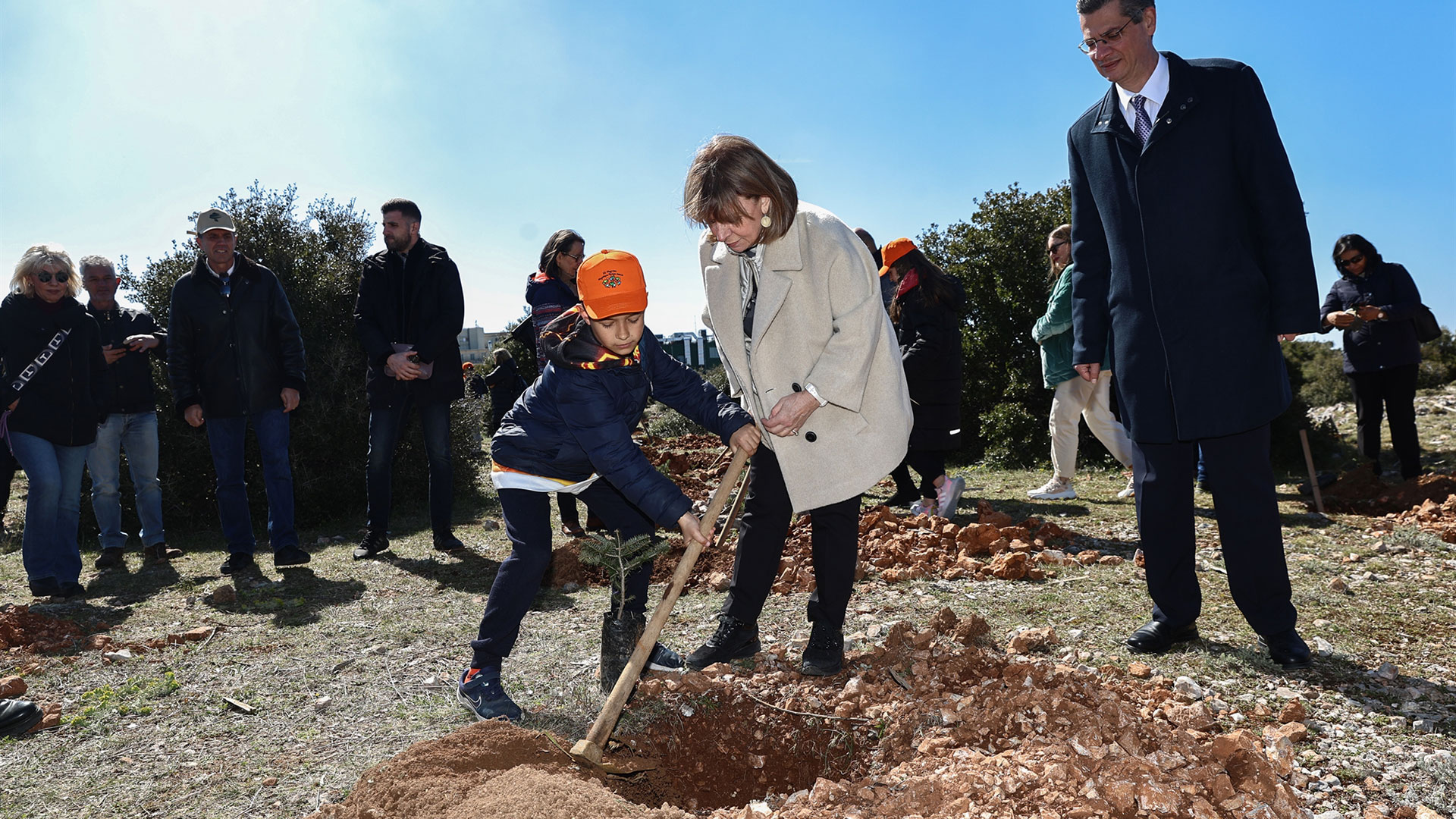 Οι παιδικές φωνές που από νωρίς αντηχούσαν στο πλάτωμα της Πάρνηθας, κοντά στο Μον Παρνές, ήταν η καλύτερη υποδοχή που θα μπορούσαν να έχουν η Πρόεδρος της Δημοκρατίας Κατερίνα Σακελλαροπούλου και οι γυναίκες πρέσβεις δεκαεπτά ξένων χωρών στην Αθήνα, που έφθασαν εκεί λίγο πριν από τις 11 χθες το πρωί. Τα παιδιά, μαθητές και μαθήτριες του 3ου Δημοτικού Σχολείου Αγίας Παρασκευής, κρατούσαν σημαίες που τα ίδια είχαν ζωγραφίσει και αντιστοιχούσαν στις χώρες των οποίων οι γυναίκες πρέσβεις ανταποκρίθηκαν στην πρόσκληση της Προέδρου της Δημοκρατίας για συμβολική δενδροφύτευση με αφορμή τη χθεσινή Διεθνή Ημέρα Δασών. Μακριά από το αυστηρό πρωτόκολλο που ο ρόλος τους επιτάσσει, η Πρόεδρος και οι πρέσβεις μαζί με τα παιδιά ρίχτηκαν στη δενδροφύτευση. Σε μια έκταση τεσσάρων στρεμμάτων, που είχε καεί στην πυρκαγιά του 2007, φυτεύτηκαν μικρά έλατα για να συμπληρώσουν και να ενισχύσουν την ήδη ορατή φυσική αναγέννηση του δάσους. Η Πρόεδρος της Δημοκρατίας ευχαρίστησε τις γυναίκες πρέσβεις που ανταποκρίθηκαν στην πρόσκλησή της «να κάνουμε μαζί μια δενδροφύτευση στην Πάρνηθα, σε μια συμβολική κίνηση ανανέωσης της δέσμευσής μας να προστατεύσουμε τον πολύτιμο φυσικό μας πλούτο». Και υπογράμμισε ότι «τα δάση είναι εξαιρετικής σημασίας για τον άνθρωπο, το περιβάλλον, τη βιοποικιλότητα. Η βιώσιμη διαχείριση είναι ο μόνος ενδεδειγμένος τρόπος για να προφυλάξουμε αυτό το πολύτιμο φυσικό στοιχείο, τόσο για εμάς όσο και, κυρίως, για τις επόμενες γενιές». Ακολούθησε ενημέρωση στο Καταφύγιο, όπου ο υπουργός Περιβάλλοντος και Ενέργειας Θόδωρος Σκυλακάκης ανέλυσε τις προκλήσεις της κλιματικής κρίσης και τις προτεραιότητες για την αντιμετώπισή τους, ενώ οι υπεύθυνοι της Γενικής Διεύθυνσης Δασών και Δασικού Περιβάλλοντος μίλησαν για τη σημασία του Εθνικού Δρυμού της Πάρνηθας.