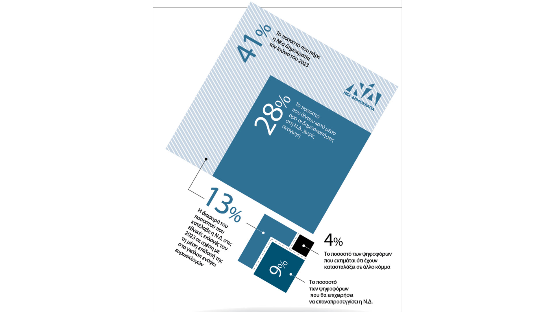 Η Ν.Δ. χρειάζεται τριπλή στρατηγική για να προσεγγίσει κάθε ομάδα από το 9% που δείχνει να έχει απομακρυνθεί. Εάν τα καταφέρει τουλάχιστον με τους μισούς, θα περάσει τον πήχυ του 33%.