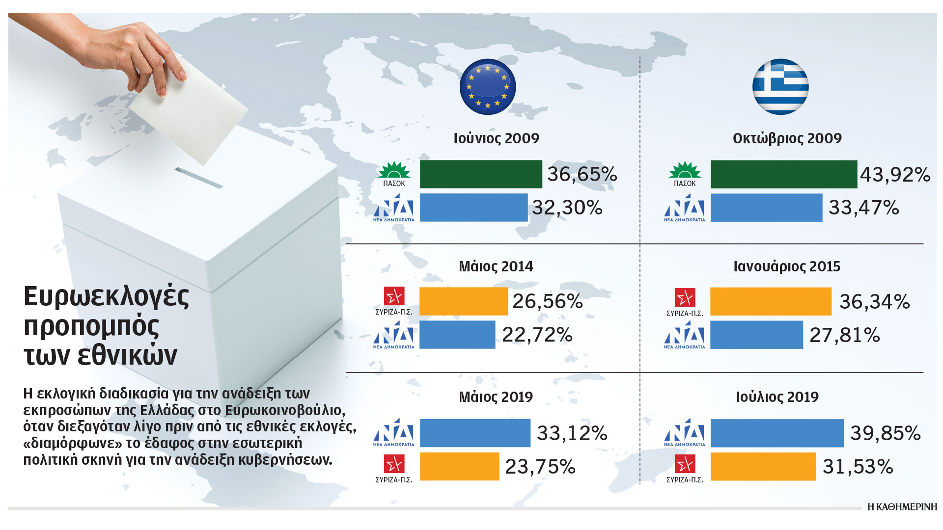 Παραδοσιακά, οι εκλογές για την ανάδειξη των εκπροσώπων κομμάτων και της Ελλάδας στο Ευρωκοινοβούλιο όταν διεξάγονταν λίγο πριν από τις εθνικές εκλογές, είχαν ρόλο διαμορφωτή του εδάφους στην εσωτερική πολιτική σκηνή για την ανάδειξη κυβερνήσεων. Ενδεικτικά αναφέρεται η περίπτωση των ευρωεκλογών του 2009 που «έδειχναν» την επερχόμενη λίγο μετά άνοδο του ΠΑΣΟΚ στην κυβέρνηση, ή και του 2014 που «προανήγγειλαν» την έπειτα από λίγους μήνες ανάδειξη του ΣΥΡΙΖΑ σε πρώτο κόμμα εξουσίας και κορμό συγκυβέρνησης.