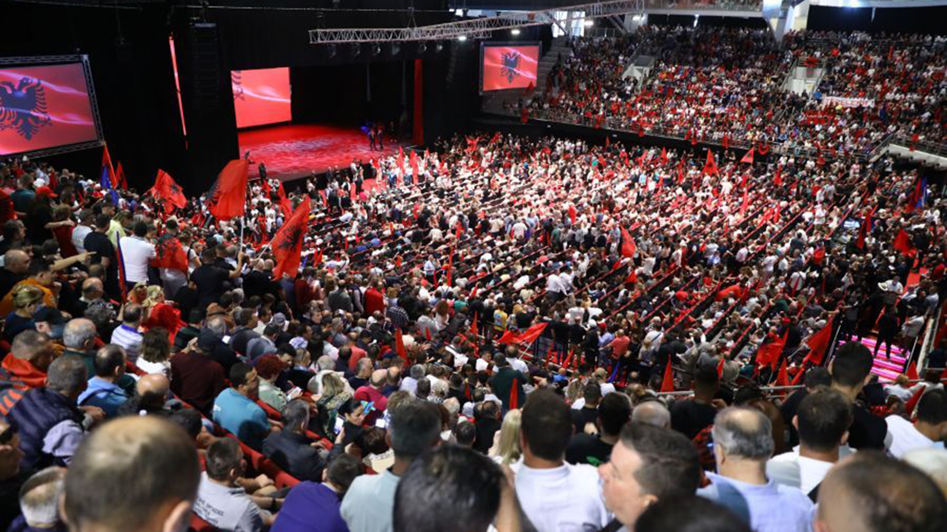 Υπό δρακόντεια μέτρα ασφαλείας πραγματοποιείται η συγκέντρωση Αλβανών μεταναστών, μελών και φίλων του κόμματός του Εντι Ράμα στο κλειστό γήπεδο του Γαλατσίου.