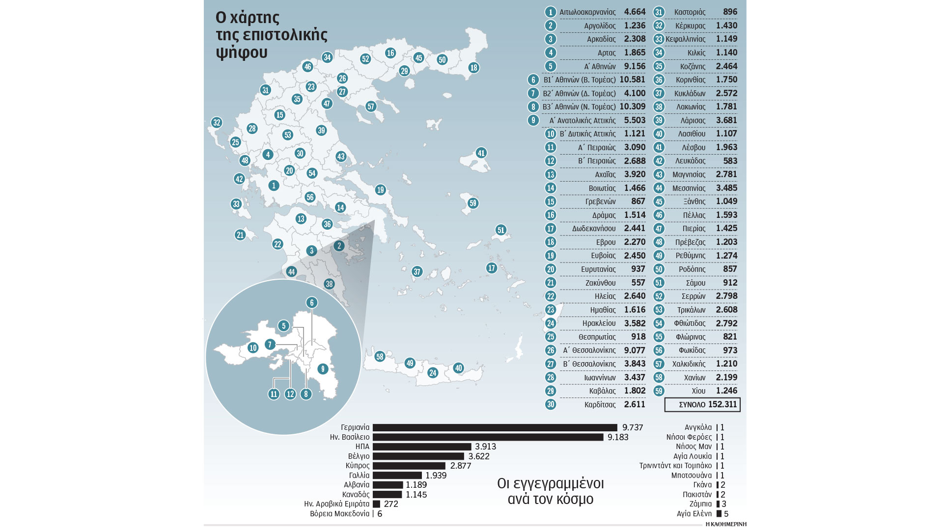 Η «Κ» παρουσιάζει την κατανομή των ψηφοφόρων διά επιστολικής ψήφου σε Ελλάδα και εξωτερικό. Η διαδικασία βρίσκεται σε εξέλιξη και αποτελεί ένα «πείραμα» που η κυβέρνηση θέλει να πετύχει με στόχο να εφαρμοστεί και στις εθνικές εκλογές.