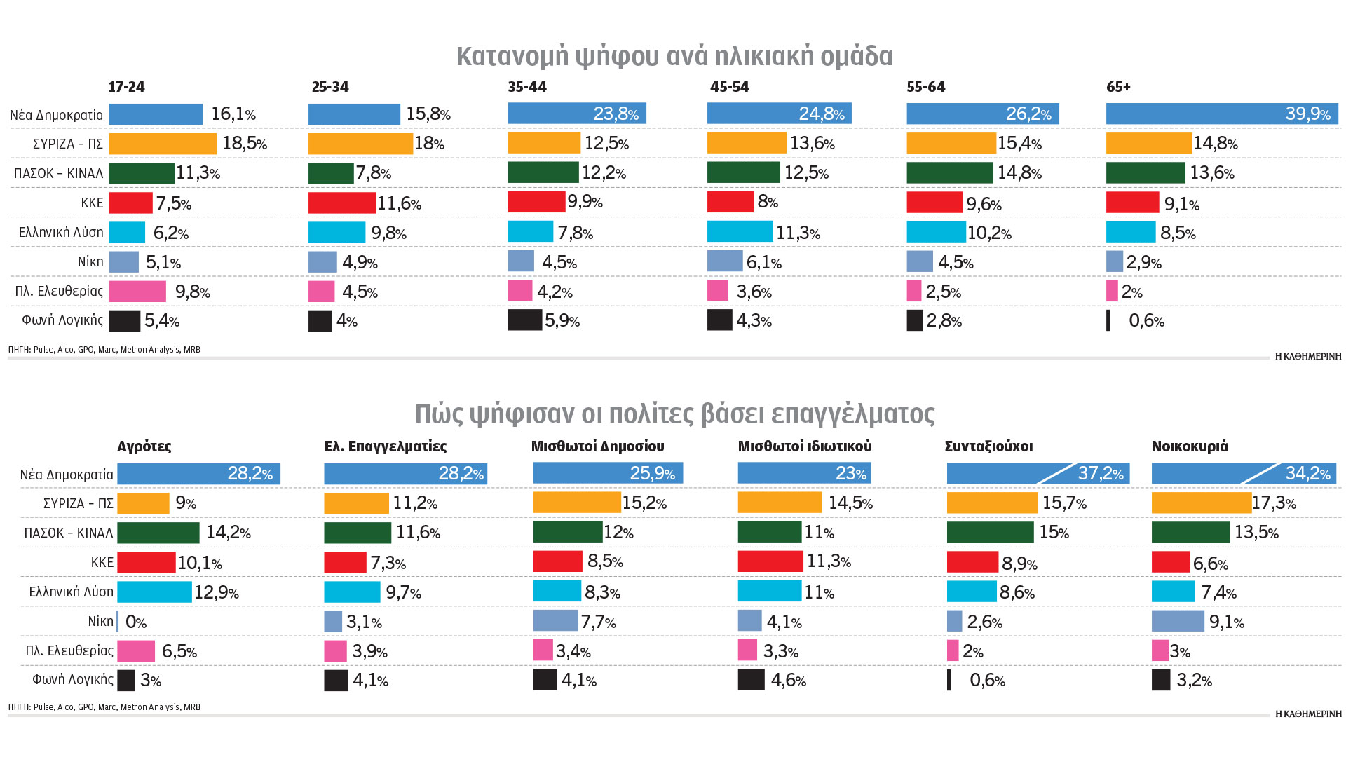 Μια πλήρη ακτινογραφία της κάλπης, του τρόπου που ψήφισαν οι πολίτες ανά κατηγορία –ηλικιακή, επαγγελματική, πολιτικής προέλευσης– δίνει η ανάλυση των δεδομένων του exit poll που πραγματοποιήθηκε την Κυριακή. Αποτυπώνεται από τα στοιχεία που συγκεντρώθηκαν και την επεξεργασία που έγινε η «ταυτότητα» των εκλογών και η προέλευση των ψηφοφόρων κάθε κόμματος.