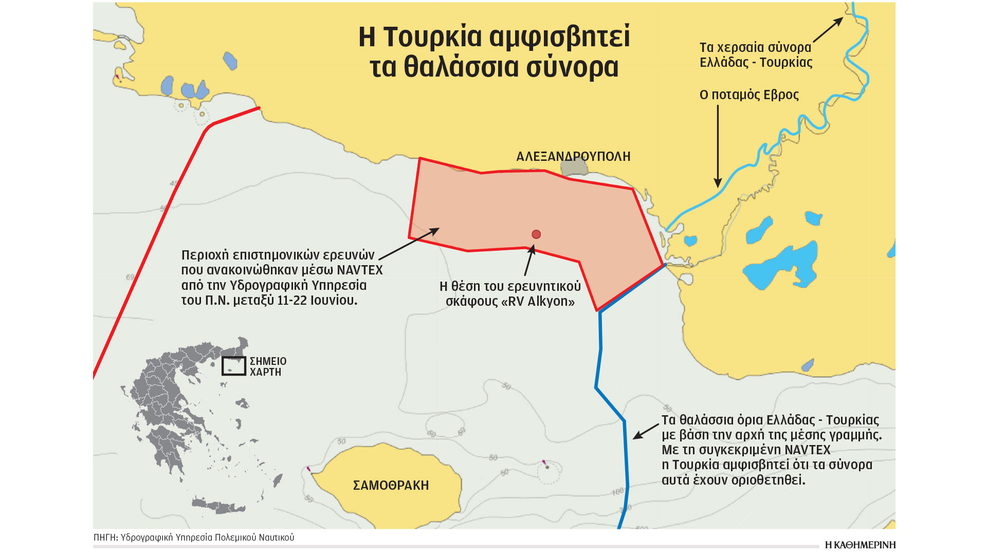 Με σαφή και ξεκάθαρο τρόπο η Αγκυρα αμφισβητεί και τα γενικώς παραδεδεγμένα περί χρήσης της μέσης γραμμής, ακόμη και στις εκβολές ποταμών, για την οριοθέτηση θαλασσίων συνόρων. Με NAVTEX του σταθμού της Σμύρνης (0536/24), η Αγκυρα καταγγέλλει τις επιστημονικές έρευνες που έχουν ανακοινωθεί από την Αθήνα με το επιστημονικό σκάφος «R/V Alkyon» (NAVTEX 091/24 του σταθμού Υδρογραφικής Υπηρεσίας Λήμνου), στις εκβολές του Εβρου, εντός ελληνικών χωρικών υδάτων μέχρι και τις 22 Ιουνίου. Η περιοχή που έχει δεσμευθεί, αναφέρεται στην τουρκική NAVTEX, «είναι πλησίον και εντός των πλευρικού θαλασσίου ορίου Ελλάδας – Τουρκίας, το οποίο δεν έχει ακόμη οριοθετηθεί».
