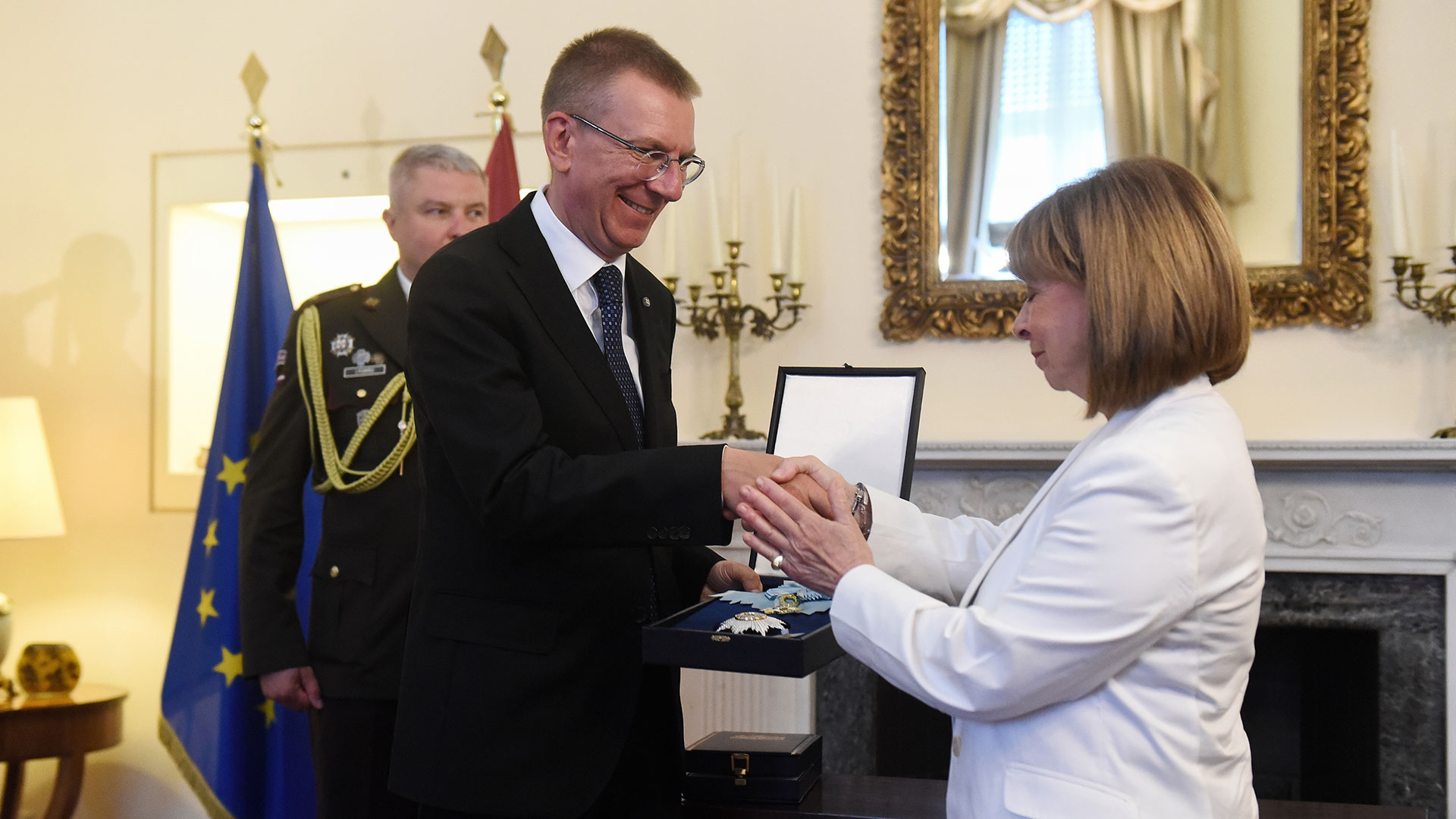 Με τη σειρά του, ο πρόεδρος της Λετονίας απένειμε στην κ. Σακελλαροπούλου τον Μεγαλόσταυρο του Τάγματος των Τριών Αστέρων.