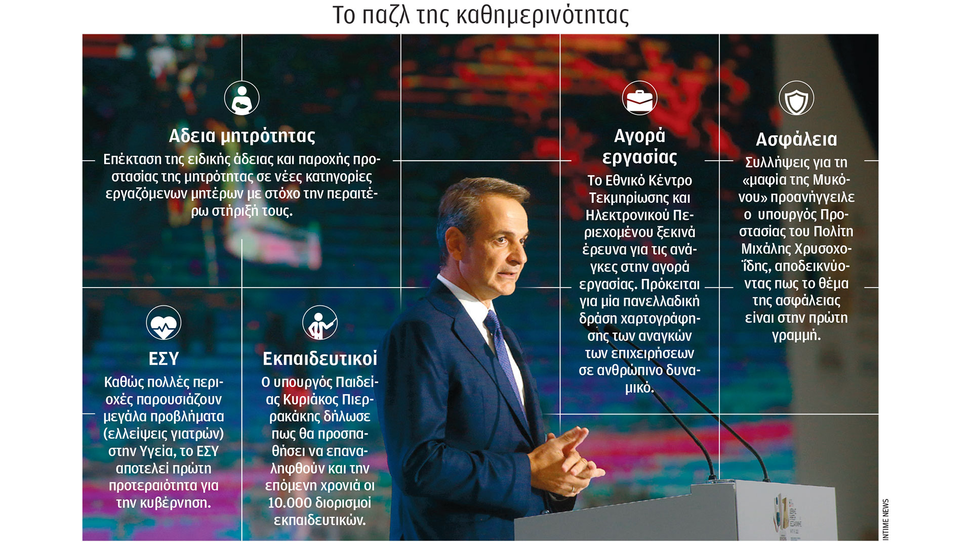 Η κυβέρνηση από τις ευρωεκλογές και μετά έχει μπει σε έναν συγκεκριμένο σχεδιασμό που έχει στο επίκεντρο τη βελτίωση της καθημερινότητας, και αυτό θα αποτελεί και το βασικό μήνυμα που θα εκπέμψει ο Κυριάκος Μητσοτάκης τον Σεπτέμβριο στη Διεθνή Εκθεση Θεσσαλονίκης (ΔΕΘ). Τι σημαίνει όμως καθημερινότητα; Η απάντηση δεν είναι απλή. Στο Μέγαρο Μαξίμου αντιλαμβάνονται την καθημερινότητα ως ένα πολύ μεγάλο παζλ, που τα κομμάτια του όμως μπορεί σε πολλές περιπτώσεις να είναι μικρά. «Για να υπάρξει βελτίωση της καθημερινότητας, θα πρέπει να βρούμε αυτά τα πολλά και μικρά κομμάτια του παζλ για να φτιάξουμε τη μεγάλη εικόνα», εξηγεί κυβερνητική πηγή.