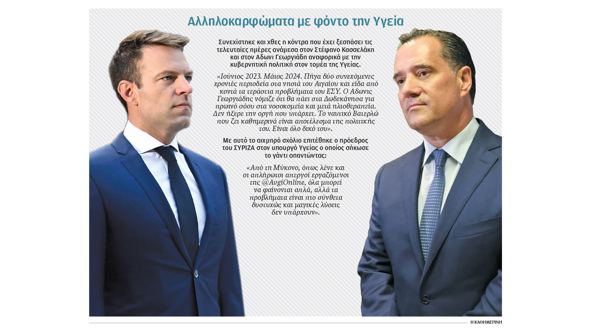 Η αντιπαράθεση ξεδιπλώνεται το τελευταίο τριήμερο, με τον Στέφανο Κασσελάκη να αναφέρει σε προηγούμενη ανάρτησή του «Ποιος υπουργός Υγείας θα μπορούσε να κάνει ποτέ αυτήν τη δήλωση: “Δημόσιο σύστημα υγείας δεν είναι μόνο το κρατικό σύστημα, είναι και το ιδιωτικό”; Ποιος άλλος θα είχε τόση ανοσία στην αξιοπρέπεια, εκτός από τον Αδωνι Γεωργιάδη;». Και με τον κ. Γεωργιάδη να απαντά: «Είναι δίκαιο να γυρνάω τα νοσοκομεία, για να δω τα προβλήματα και να βρω λύσεις στις χρόνιες ελλείψεις –και θα βρω– και να διαβάζω αυτή την ανάρτηση από έναν άνθρωπο που ένα μήνα τώρα κάνει διακοπές στη Μύκονο, έχοντας αφήσει τους εργαζομένους του απλήρωτους και χωρίς το δώρο τους;».