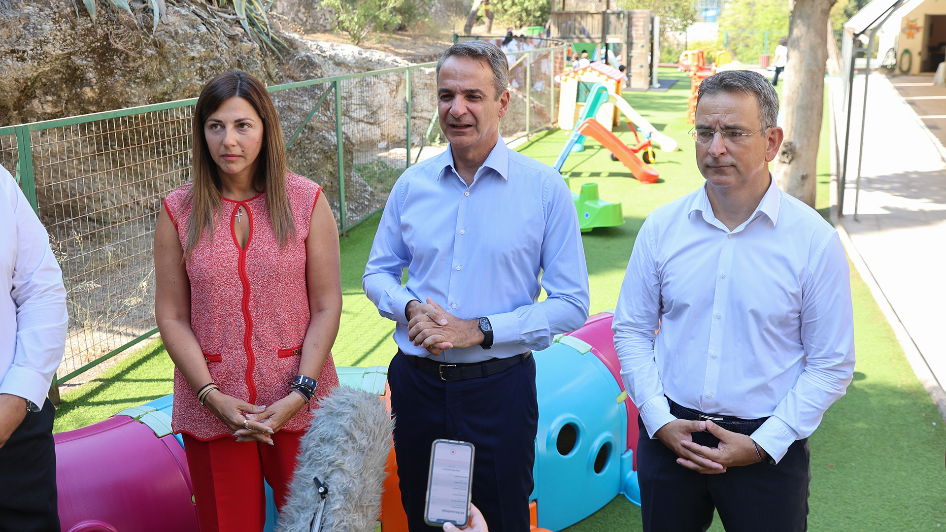 Ο πρωθυπουργός, συνοδευόμενος από την υπουργό Κοινωνικής Συνοχής και Οικογένειας, Σοφία Ζαχαράκη, ξεναγήθηκε στους χώρους του βρεφονηπιακού σταθμού και είχε την ευκαιρία να συνομιλήσει με τα παιδιά και τους εργαζομένους του σταθμού.