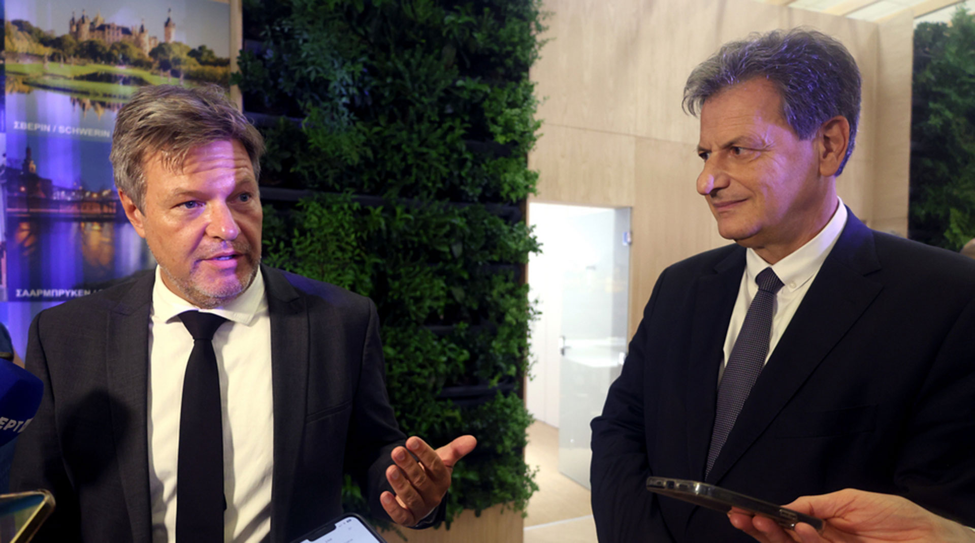 Τη δυνατότητα διασύνδεσης των ενεργειακών συστημάτων των δύο χωρών εξέτασαν στη συνάντησή τους στο περιθώριο της 88ης ΔΕΘ, ο υπουργός Περιβάλλοντος και Ενέργειας, Θεόδωρος Σκυλακάκης με τον Γερμανό αντικαγκελάριο, υπουργό Οικονομικών Υποθέσεων και Κλιματικής Προστασίας, Ρόμπερτ Χάμπεκ.
