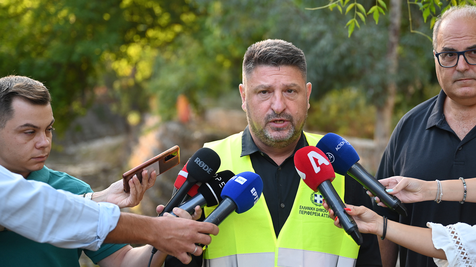 Ο περιφερειάρχης Αττικής συμπλήρωσε: «Εμείς συνεχίζουμε σε συνεργασία με τους δημάρχους μας, κάτω από δύσκολες συνθήκες. Μόνο εδώ θα δείτε ότι το ρέμα καθαρίζεται και λίγο παρακάτω είναι μπαζωμένο. Καταλαβαίνετε ότι σε αυτές οι διαδικασίες πρέπει να έχουμε νομικά εργαλεία για να τις λύνουμε αμέσως».
