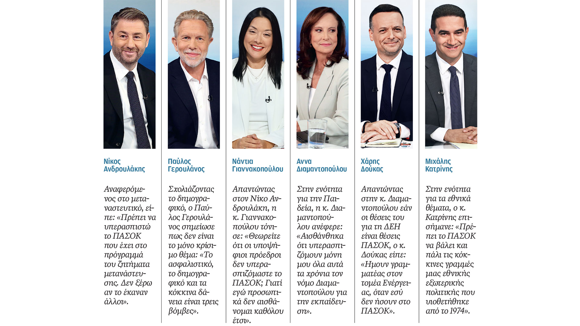 Ο κ. Ανδρουλάκης απέκρουσε παράλληλα την «κατηγορία» πως το ΠΑΣΟΚ είναι «γερασμένο κόμμα», λέγοντας πως τα τελευταία χρόνια έχει τριπλασιάσει τα ποσοστά του στις ηλικίες 18-20. Ενδιαφέρουσα χαρακτηρίστηκε η ερώτηση της κ. Διαμαντοπούλου προς τον κ. Ανδρουλάκη για την Παιδεία, λέγοντας πως το ΠΑΣΟΚ δεν υπερασπίστηκε τον «νόμο Διαμαντοπούλου», κάτι που αρνήθηκε ο πρόεδρος του ΠΑΣΟΚ.