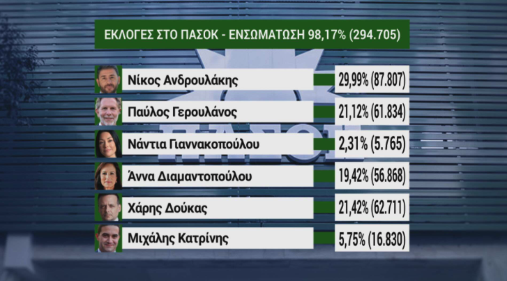 Στο 91,70% των εκλογικών τμημάτων ο Νίκος Ανδρουλάκης προηγείται με 30,52%. Δίνεται μάχη για τη δεύτερη θέση καθώς ο Χάρης Δούκας συγκεντρώνει ποσοστό 21,63% και ο Παύλος Γερουλάνος ποσοστό 20,98%. Ακολουθεί η Αννα Διαμαντοπούλου 19,16%, πέμπτος είναι ο Μιχάλης Κατρίνης με 5,45% και έκτη η Νάντια Γιαννακοπούλου με 2,25%.